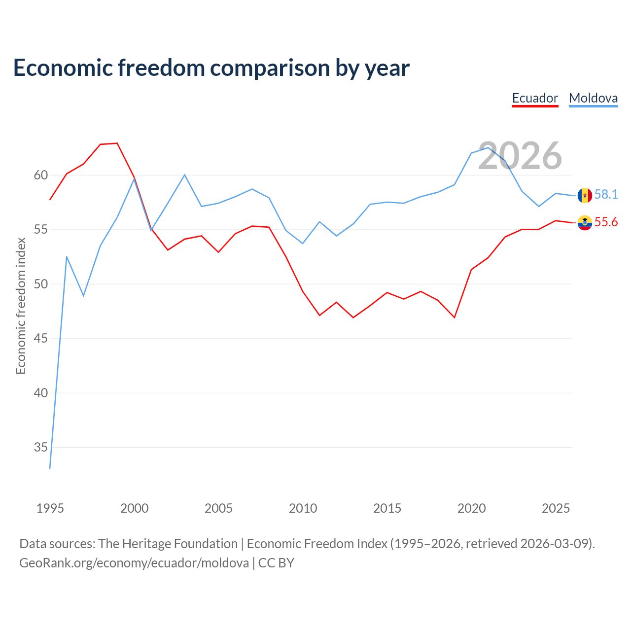 The Economic Freedom Index for Ecuador is 55.6, ranking 127/197, compared to 58.1 for Moldova, ranking 112/197. The chart above displays a comparison of annual changes in economic freedom indexes.