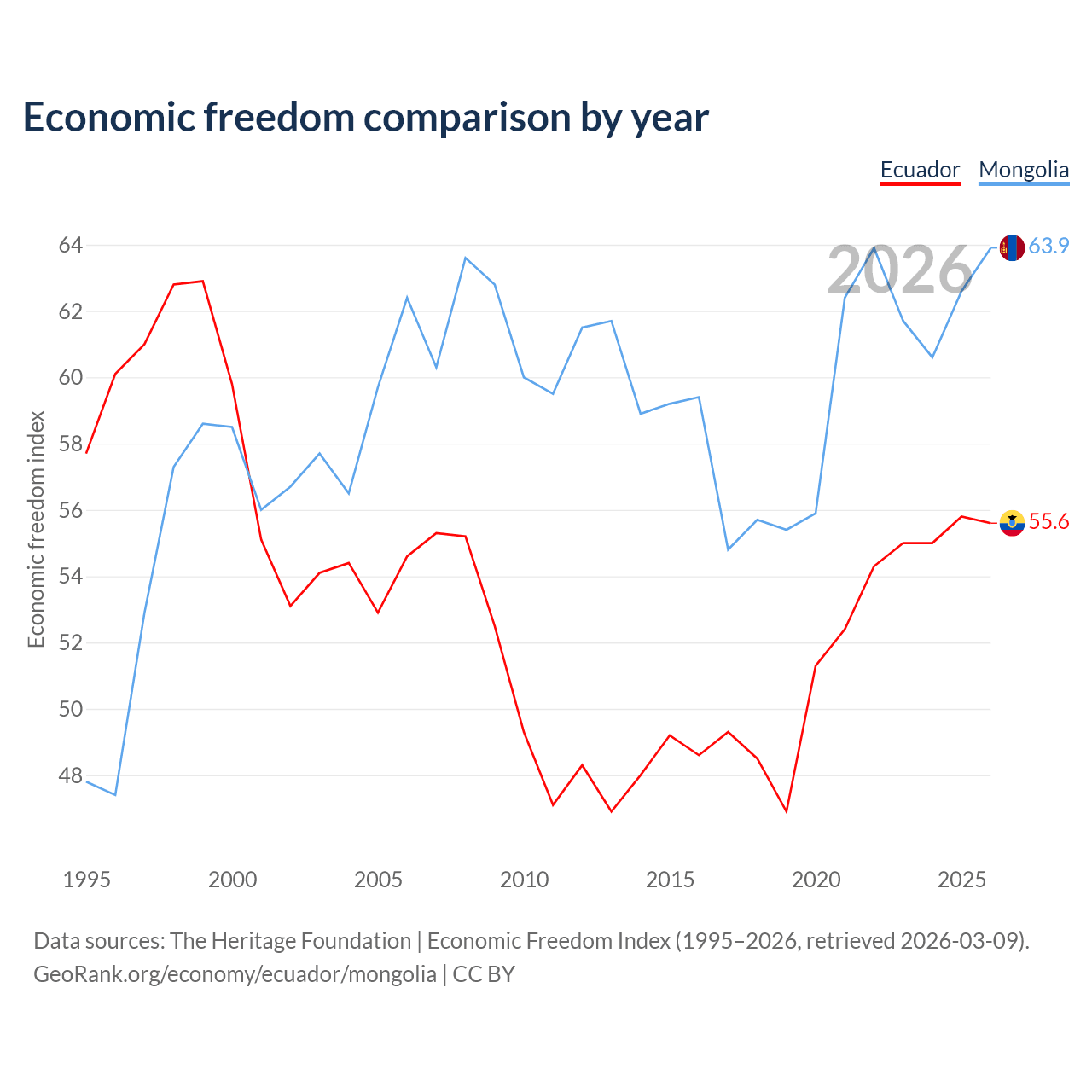 The Economic Freedom Index for Ecuador is 55.6, ranking 127/197, compared to 63.9 for Mongolia, ranking 76/197. The chart above displays a comparison of annual changes in economic freedom indexes.