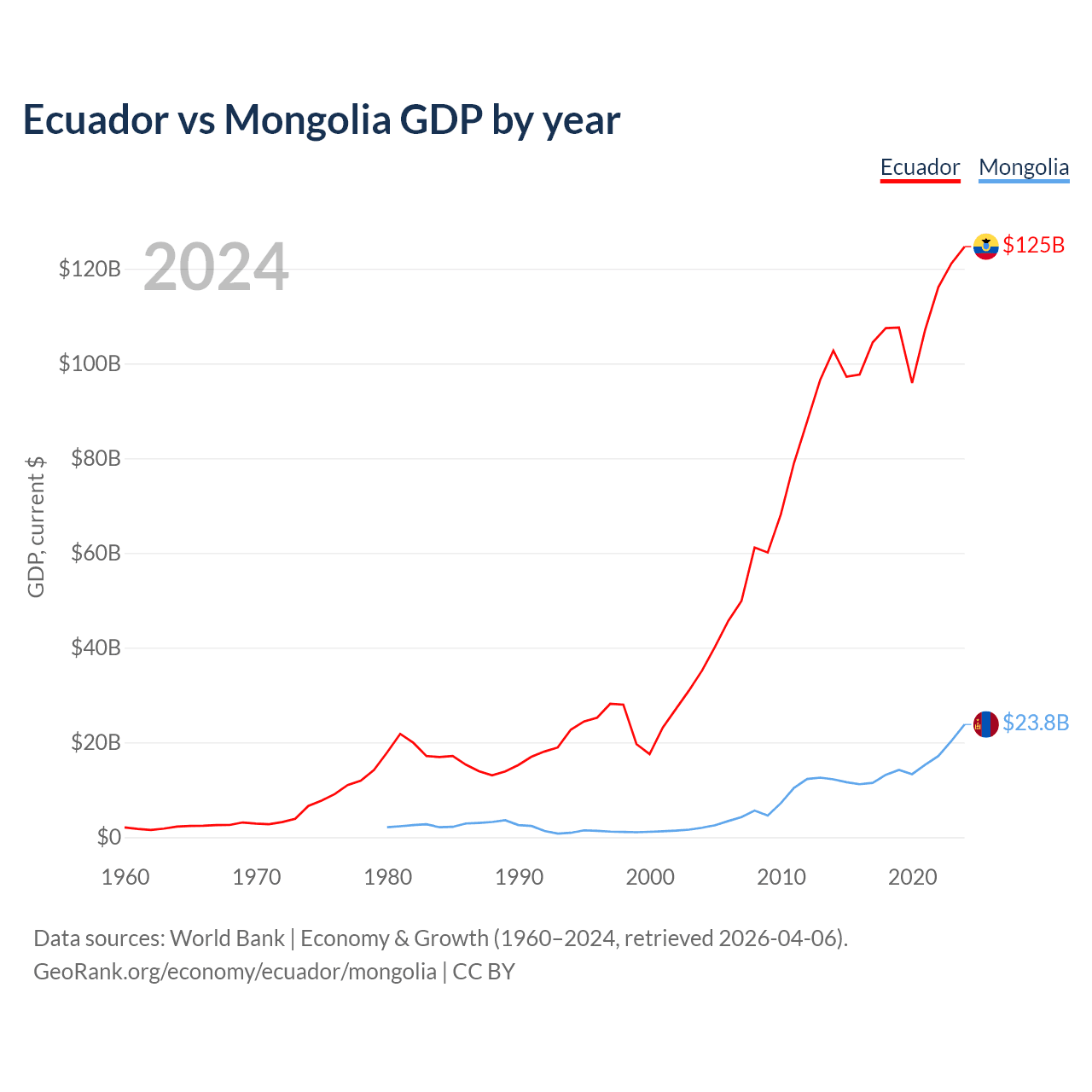 Ecuador has a GDP of $125B compared to $23.8B for Mongolia, ranking 62/197 and 121/197 by economy size, respectively.