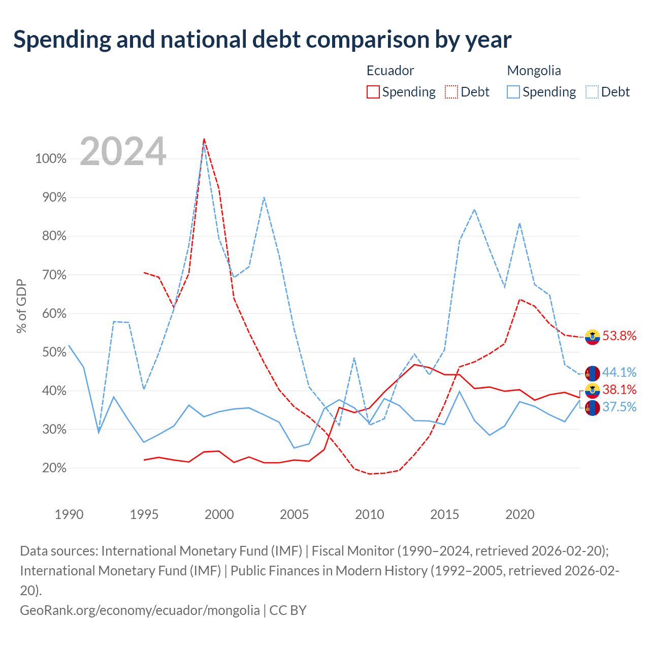 Ecuador has $67B in government debt (53.8% of GDP), compared to $10.5B (44.1% of GDP) in Mongolia.