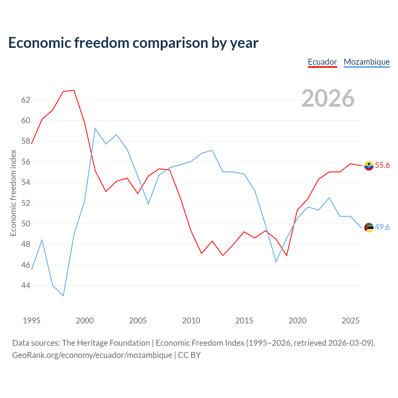 The Economic Freedom Index for Ecuador is 55.6, ranking 127/197, compared to 49.6 for Mozambique, ranking 164/197. The chart above displays a comparison of annual changes in economic freedom indexes.
