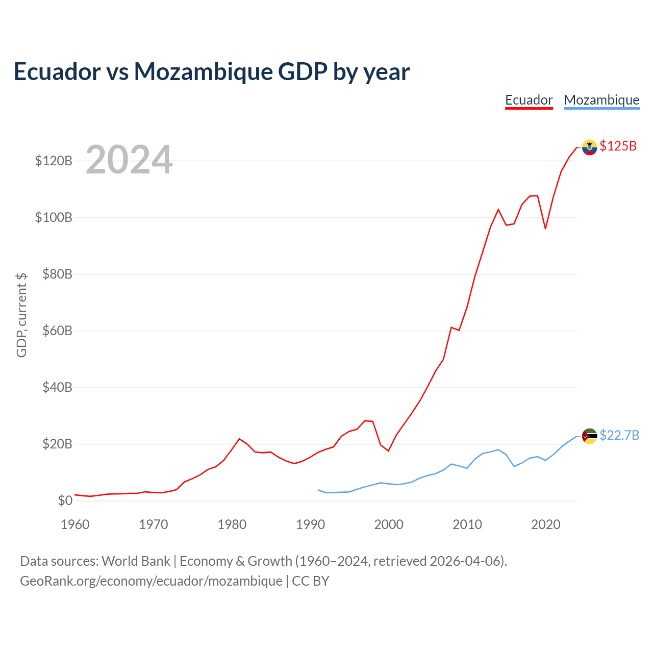 Ecuador has a GDP of $125B compared to $22.7B for Mozambique, ranking 62/197 and 123/197 by economy size, respectively.