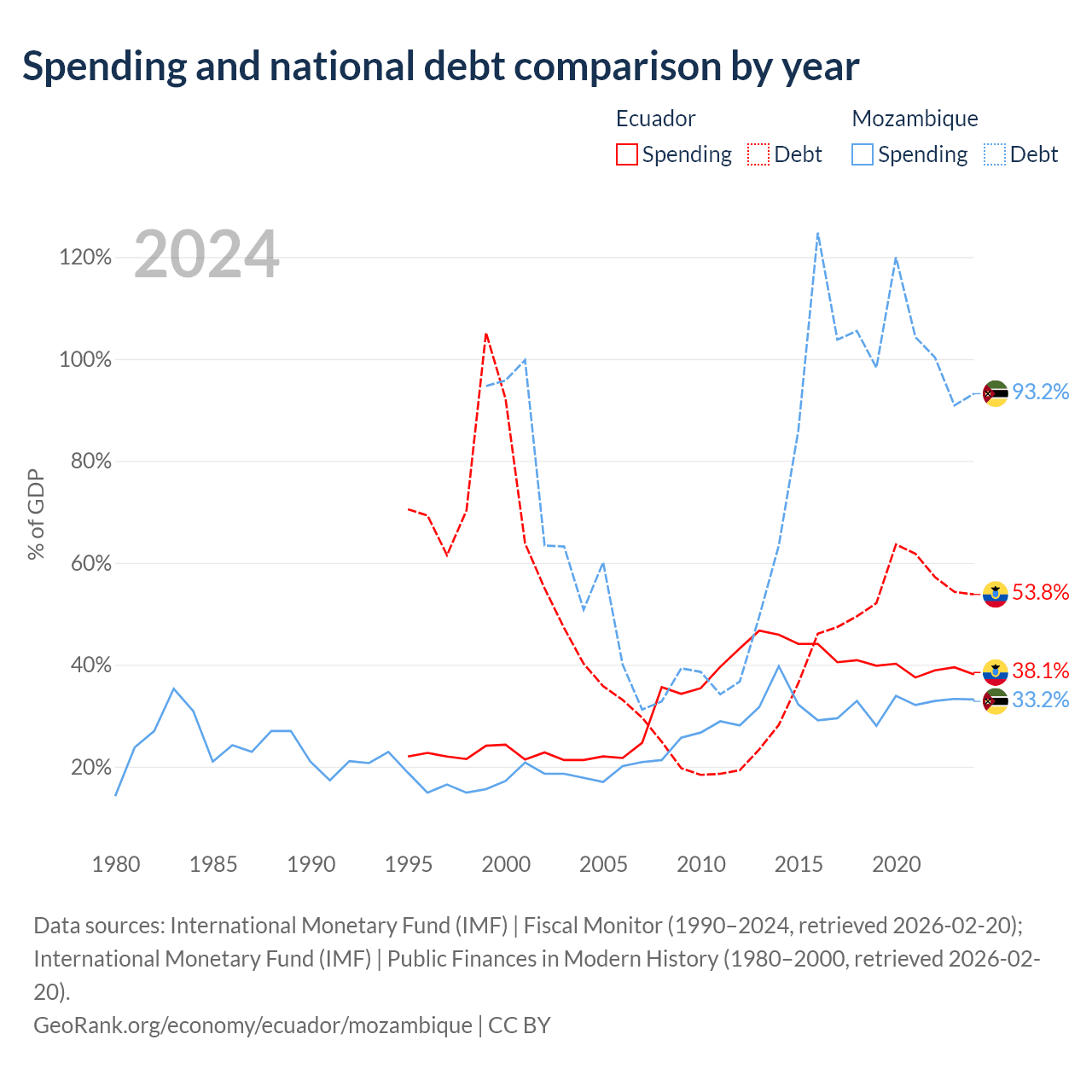 Ecuador has $67B in government debt (53.8% of GDP), compared to $21.2B (93.2% of GDP) in Mozambique.