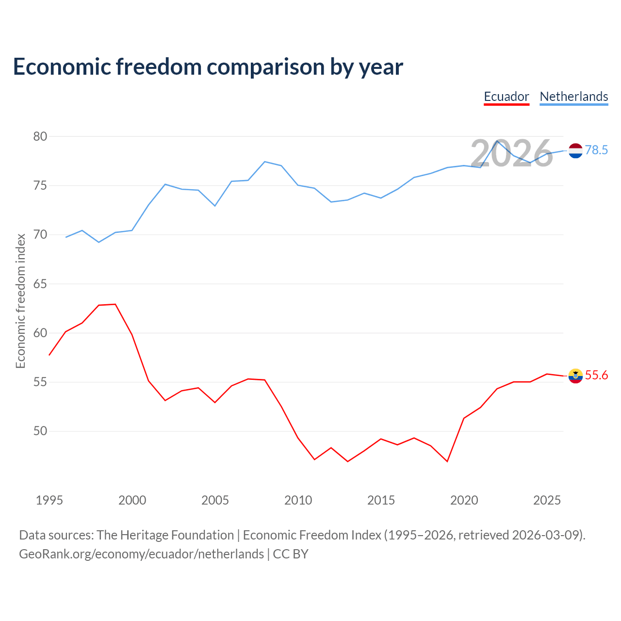 The Economic Freedom Index for Ecuador is 55.6, ranking 127/197, compared to 78.5 for the Netherlands, ranking 11/197. The chart above displays a comparison of annual changes in economic freedom indexes.