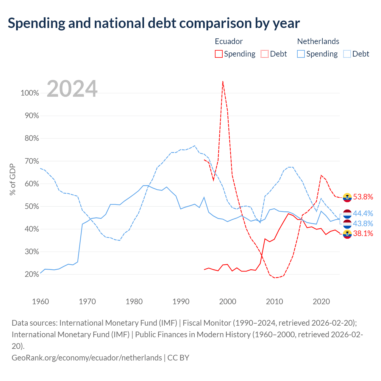 Ecuador has $67B in government debt (53.8% of GDP), compared to $532B (43.8% of GDP) in the Netherlands.