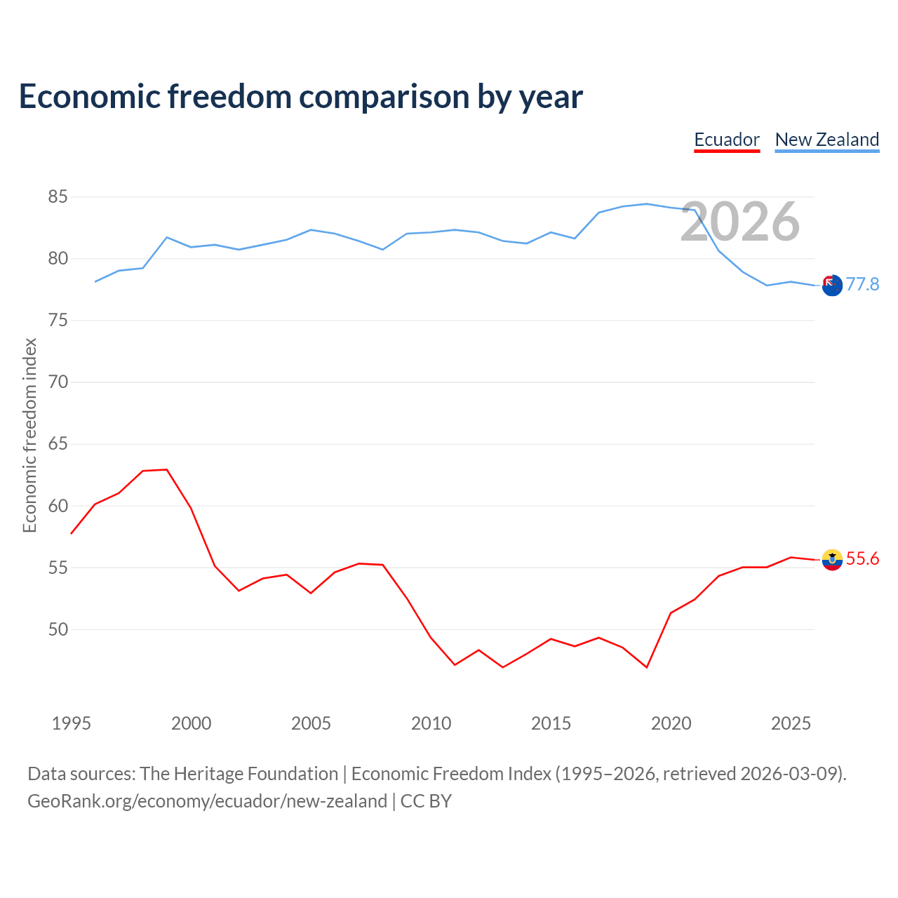 The Economic Freedom Index for Ecuador is 55.6, ranking 127/197, compared to 77.8 for New Zealand, ranking 13/197. The chart above displays a comparison of annual changes in economic freedom indexes.