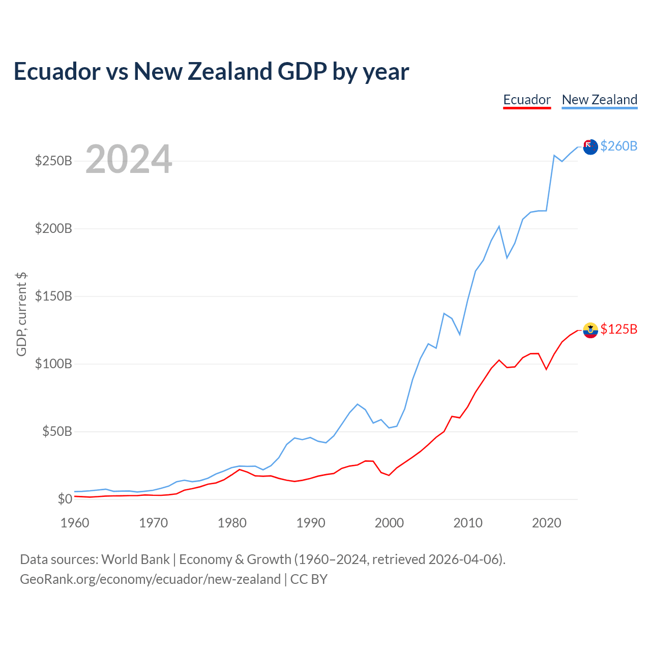 Ecuador has a GDP of $125B compared to $260B for New Zealand, ranking 62/197 and 52/197 by economy size, respectively.