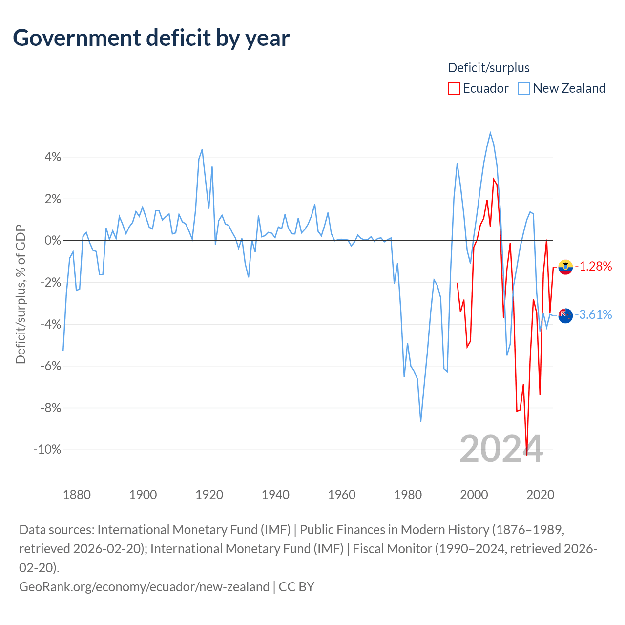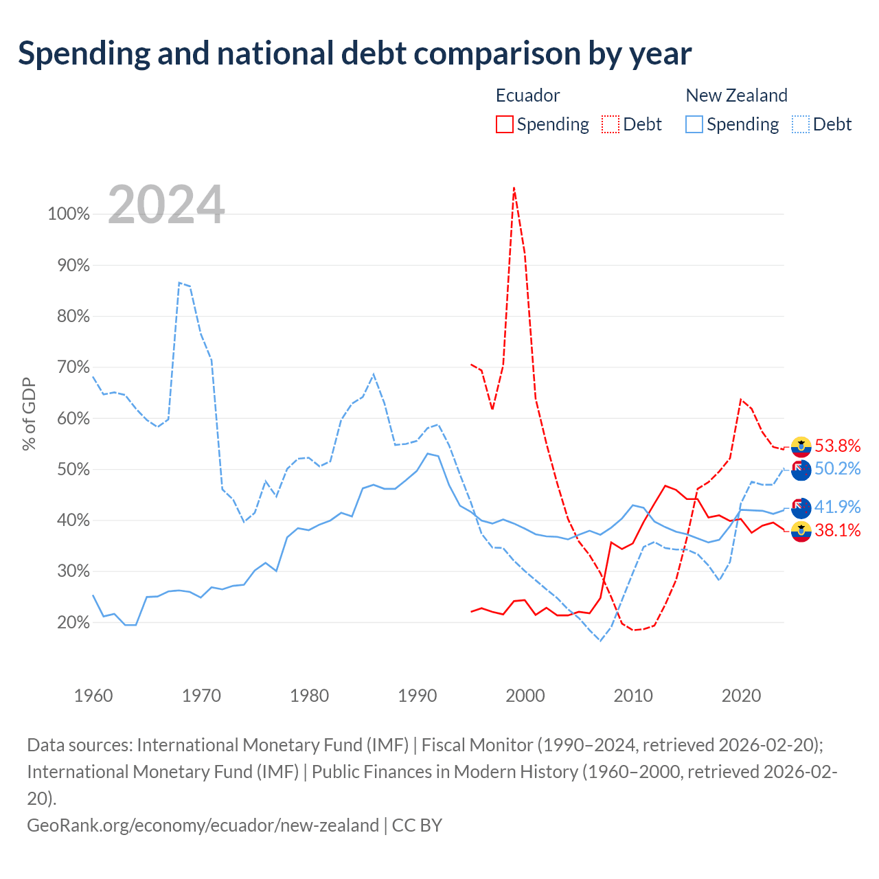 Ecuador has $67B in government debt (53.8% of GDP), compared to $131B (50.2% of GDP) in New Zealand.