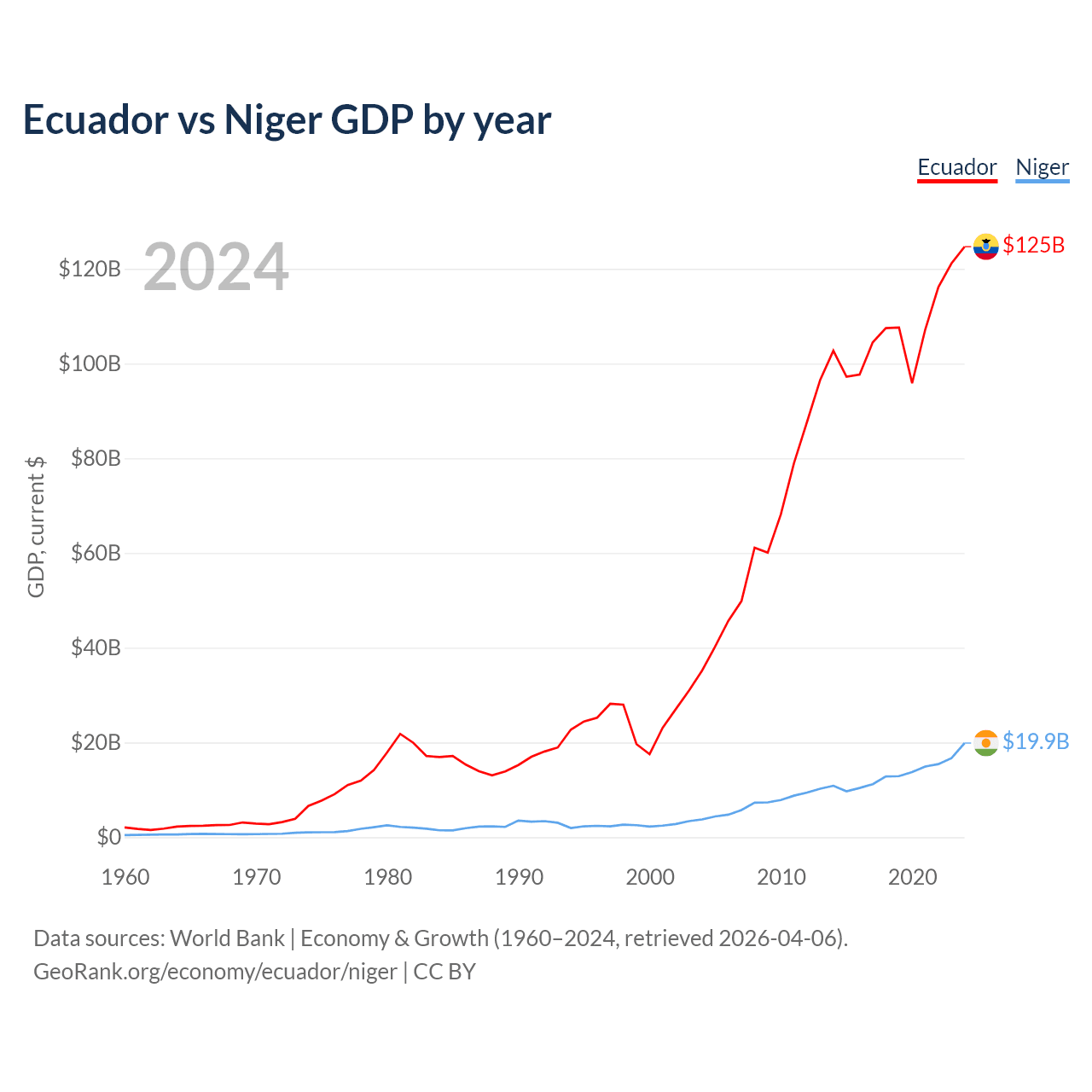 Ecuador has a GDP of $125B compared to $19.9B for Niger, ranking 62/197 and 130/197 by economy size, respectively.
