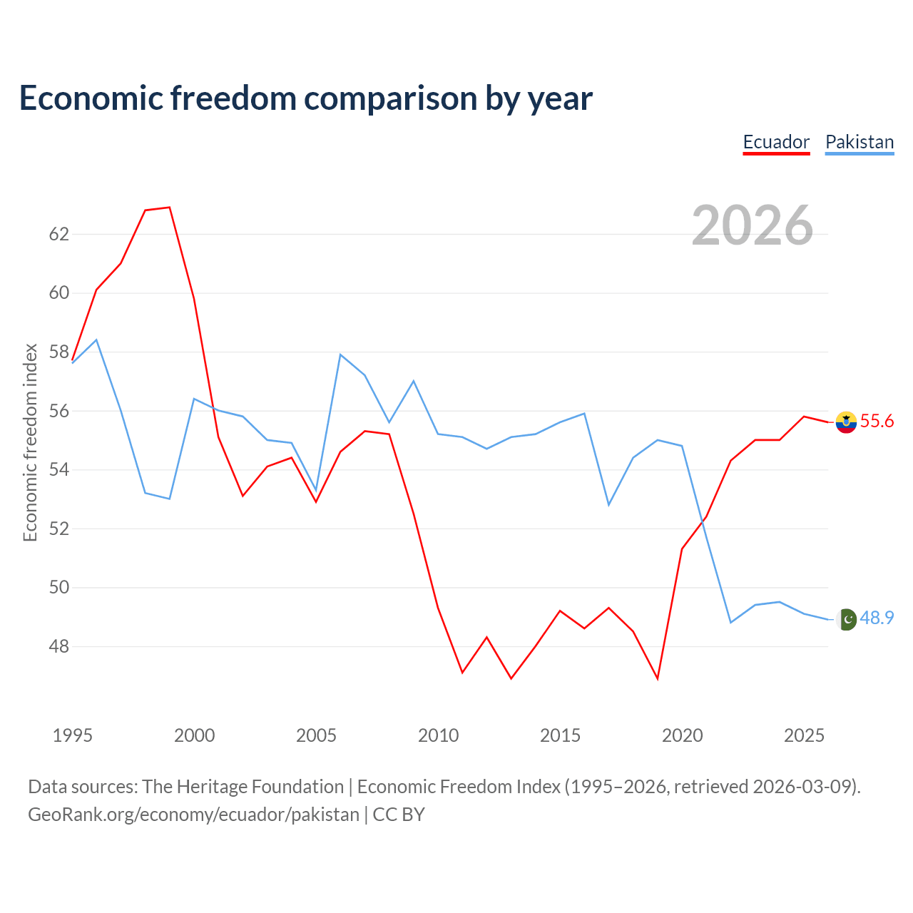 The Economic Freedom Index for Ecuador is 55.6, ranking 127/197, compared to 48.9 for Pakistan, ranking 168/197. The chart above displays a comparison of annual changes in economic freedom indexes.