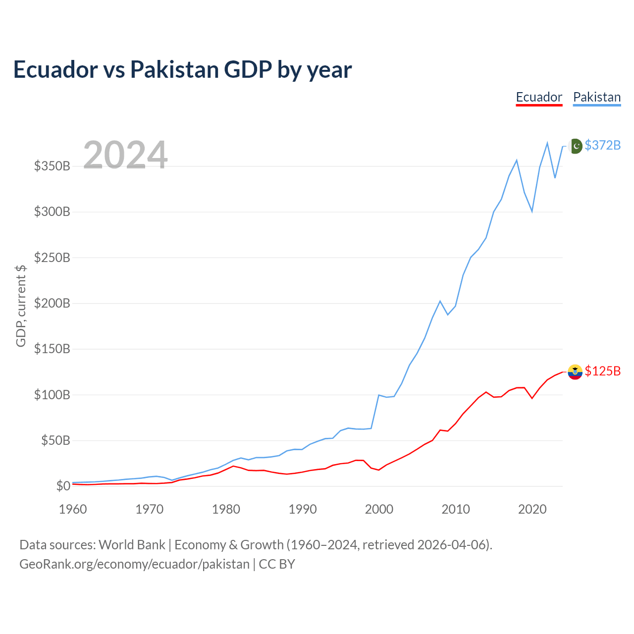 Ecuador has a GDP of $125B compared to $372B for Pakistan, ranking 62/197 and 43/197 by economy size, respectively.