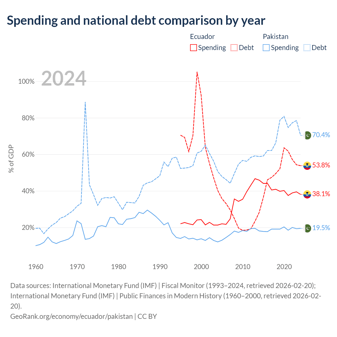 Ecuador has $67B in government debt (53.8% of GDP), compared to $262B (70.4% of GDP) in Pakistan.