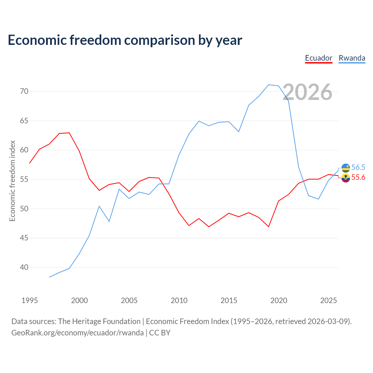 The Economic Freedom Index for Ecuador is 55.6, ranking 127/197, compared to 56.5 for Rwanda, ranking 121/197. The chart above displays a comparison of annual changes in economic freedom indexes.