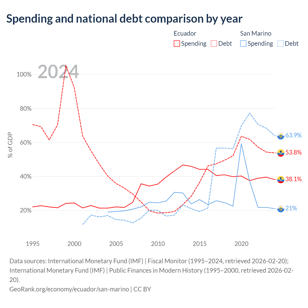 Ecuador has $67B in government debt (53.8% of GDP), compared to $1.39B (63.9% of GDP) in San Marino.