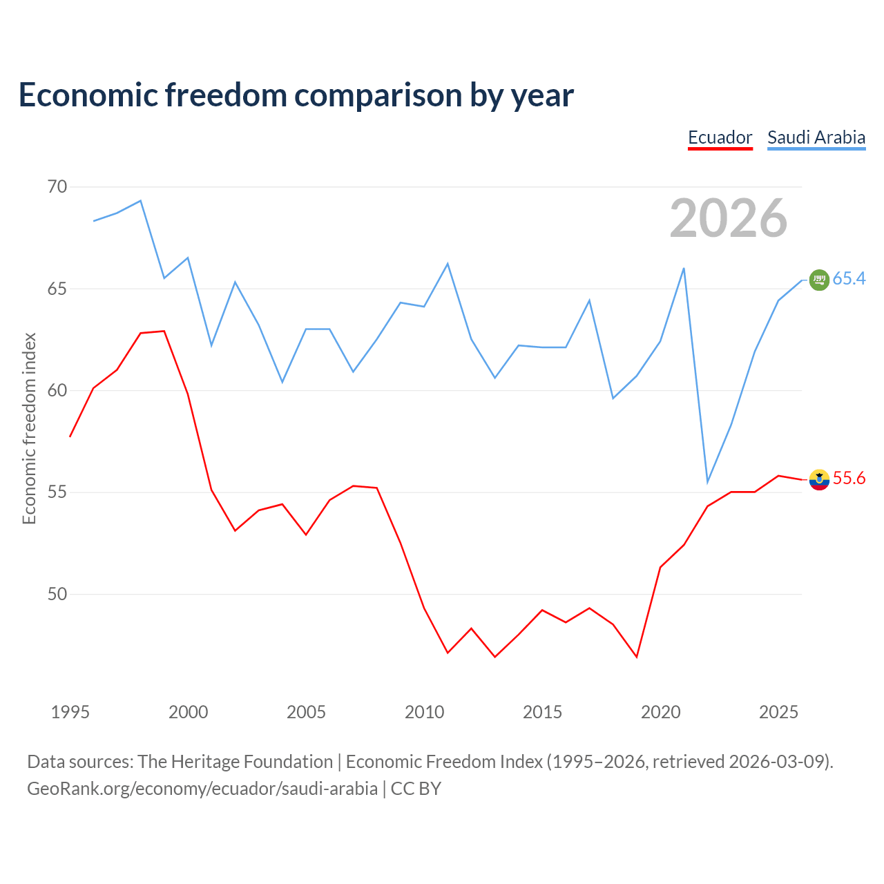 The Economic Freedom Index for Ecuador is 55.6, ranking 127/197, compared to 65.4 for Saudi Arabia, ranking 65/197. The chart above displays a comparison of annual changes in economic freedom indexes.