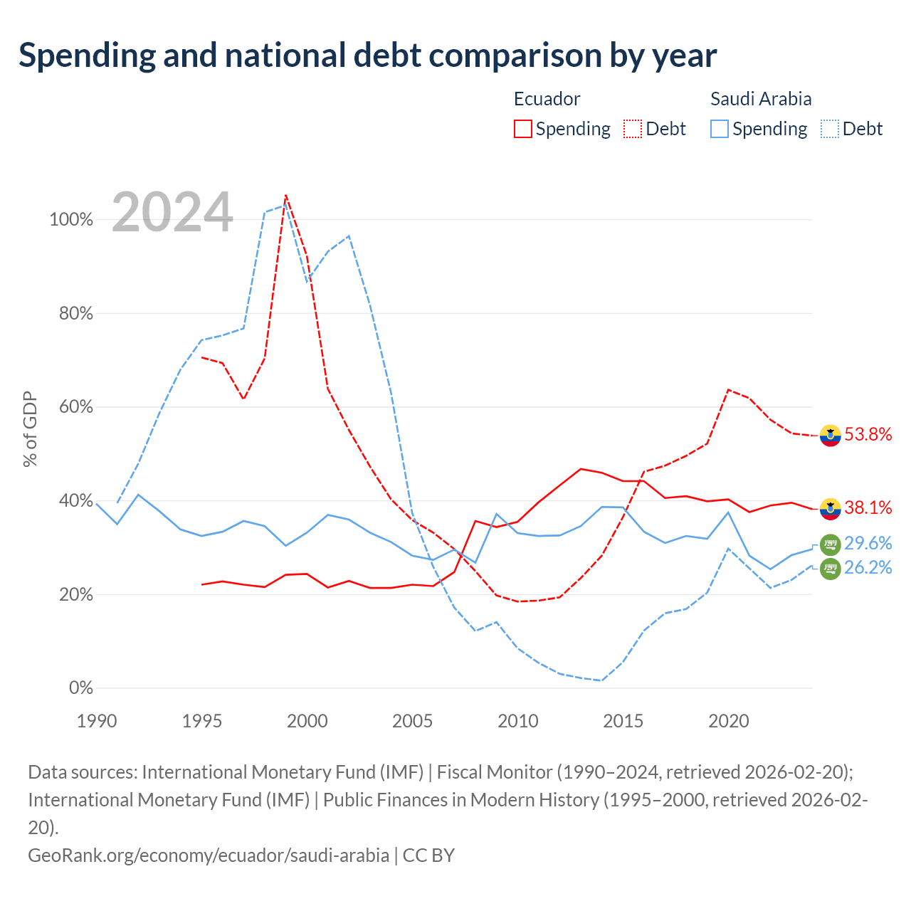 Ecuador has $67B in government debt (53.8% of GDP), compared to $324B (26.2% of GDP) in Saudi Arabia.