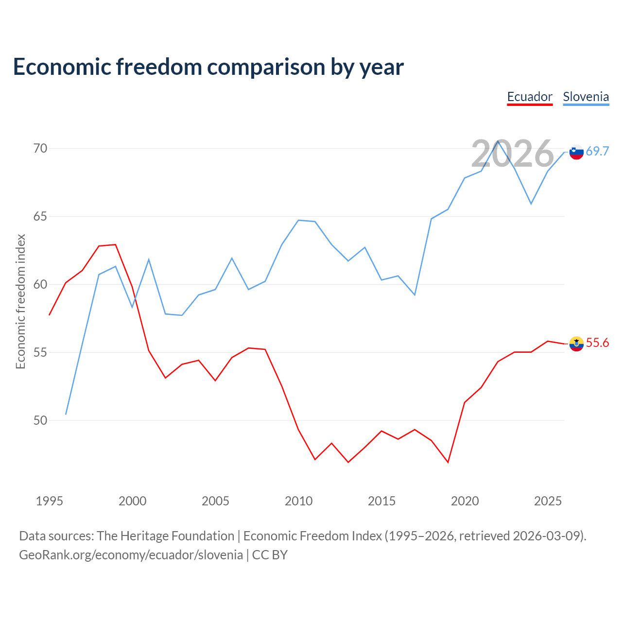 Data sources: The Heritage Foundation | Economic Freedom Index (1995–2026, retrieved 2026-03-09).