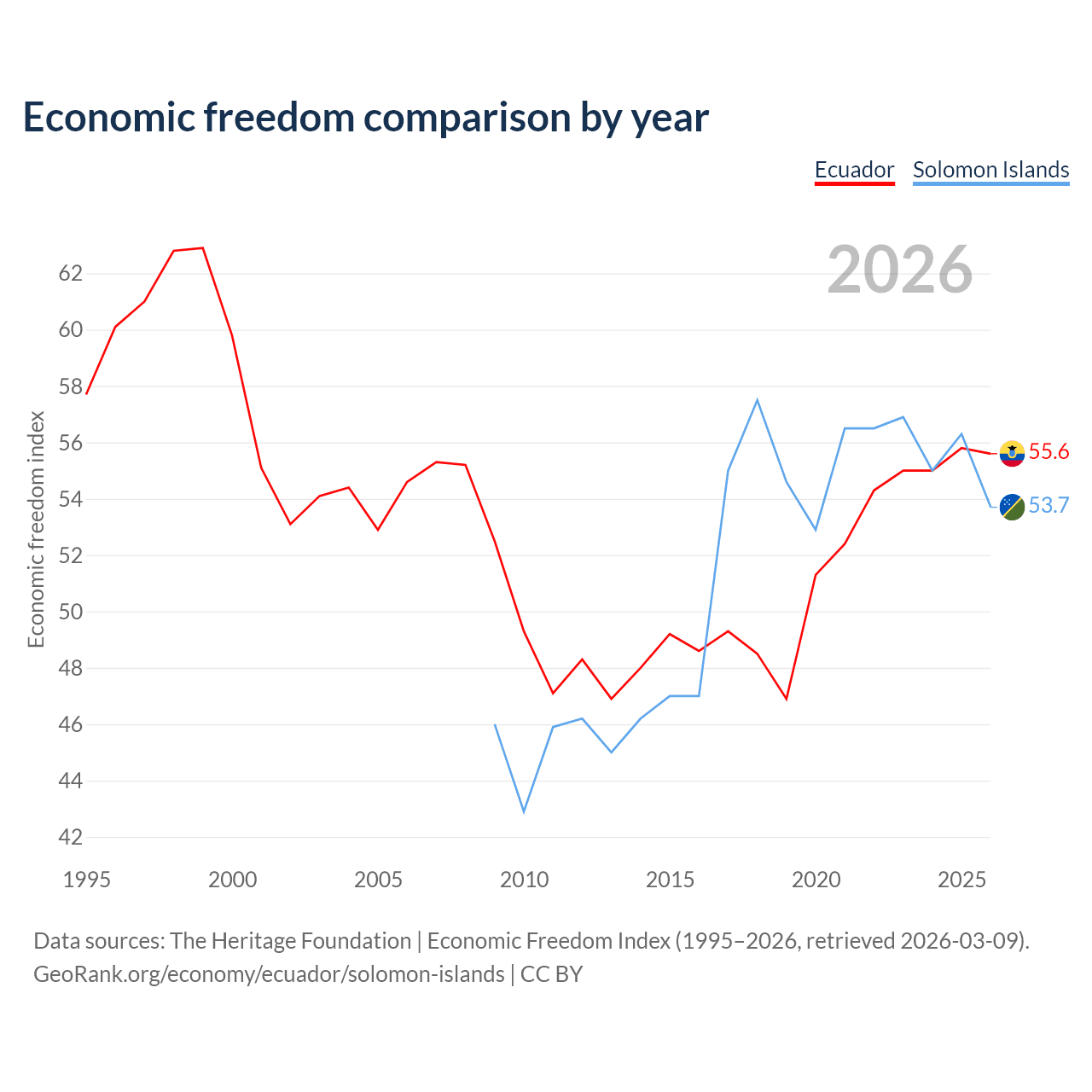 The Economic Freedom Index for Ecuador is 55.6, ranking 127/197, compared to 53.7 for the Solomon Islands, ranking 137/197. The chart above displays a comparison of annual changes in economic freedom indexes.