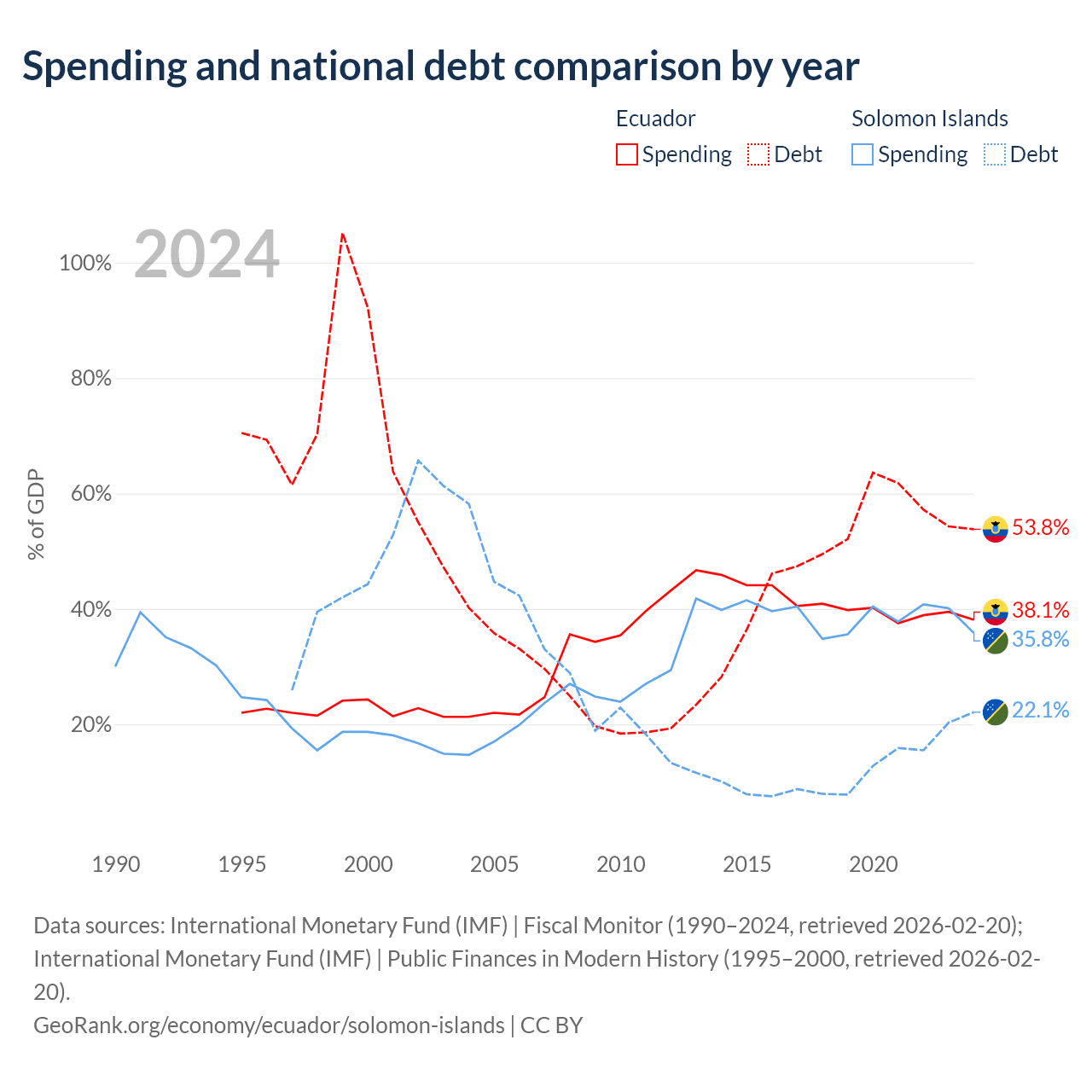 Ecuador has $67B in government debt (53.8% of GDP), compared to $350M (22.1% of GDP) in the Solomon Islands.