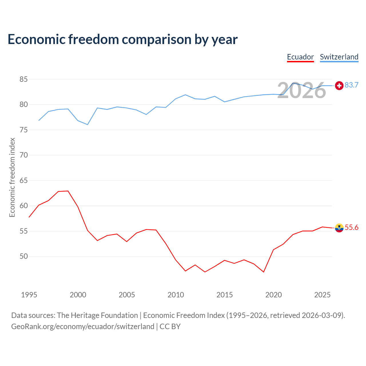 The Economic Freedom Index for Ecuador is 55.6, ranking 127/197, compared to 83.7 for Switzerland, ranking 2/197. The chart above displays a comparison of annual changes in economic freedom indexes.