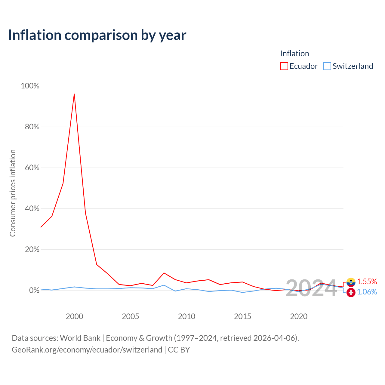 Ecuador has a GDP of $125B compared to $937B for Switzerland, ranking 62/197 and 20/197 by economy size, respectively.
