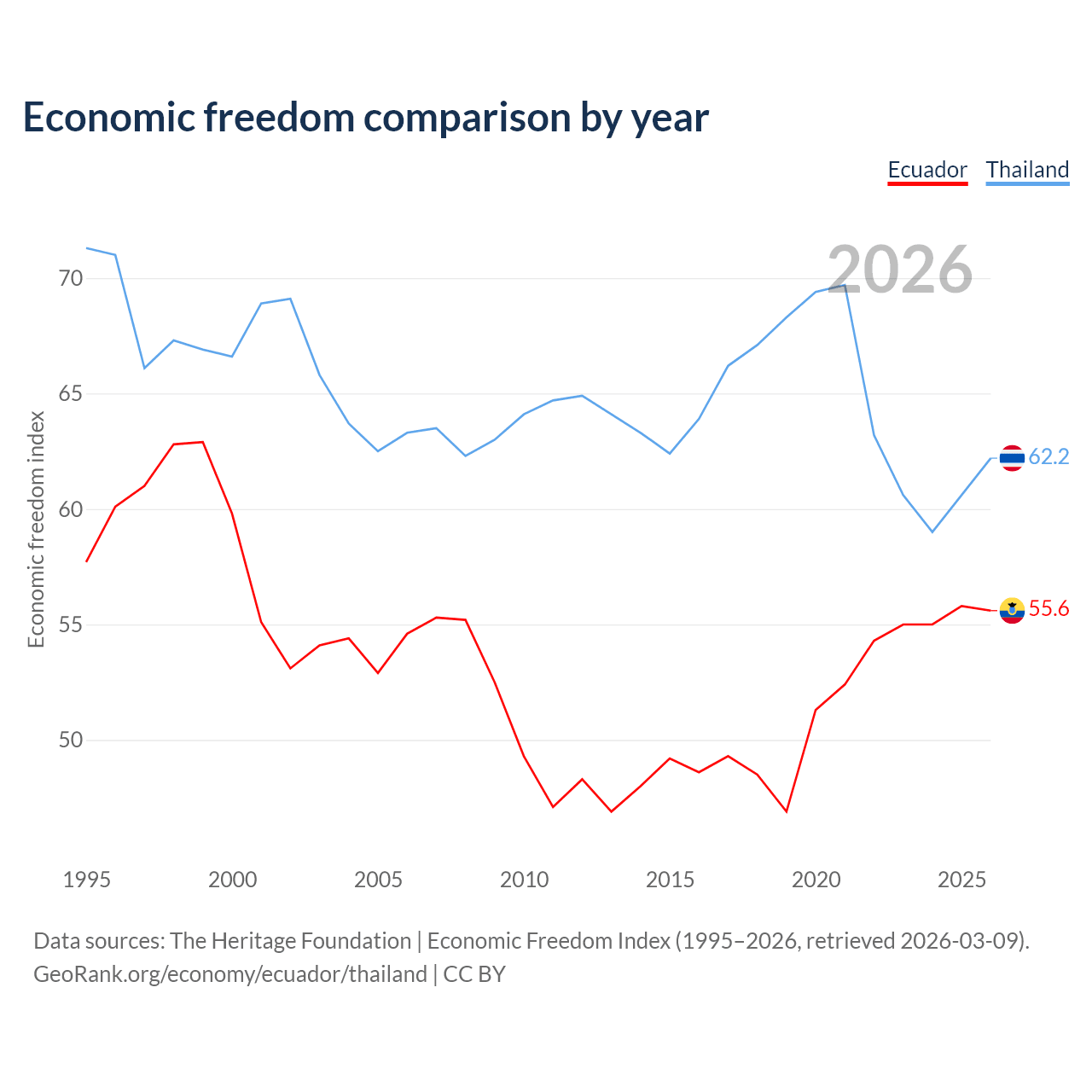 The Economic Freedom Index for Ecuador is 55.6, ranking 127/197, compared to 62.2 for Thailand, ranking 88/197. The chart above displays a comparison of annual changes in economic freedom indexes.
