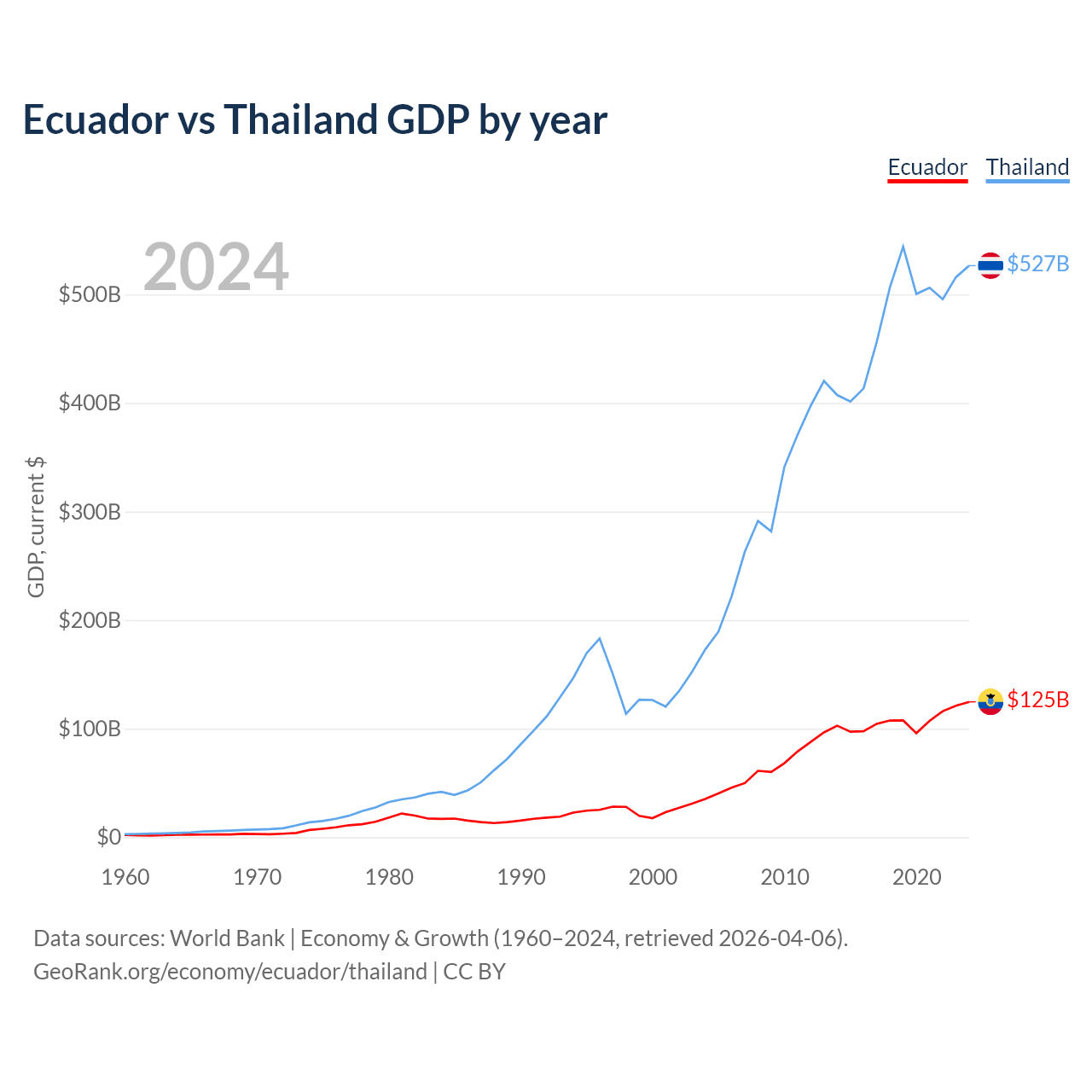 Ecuador has a GDP of $125B compared to $527B for Thailand, ranking 62/197 and 31/197 by economy size, respectively.
