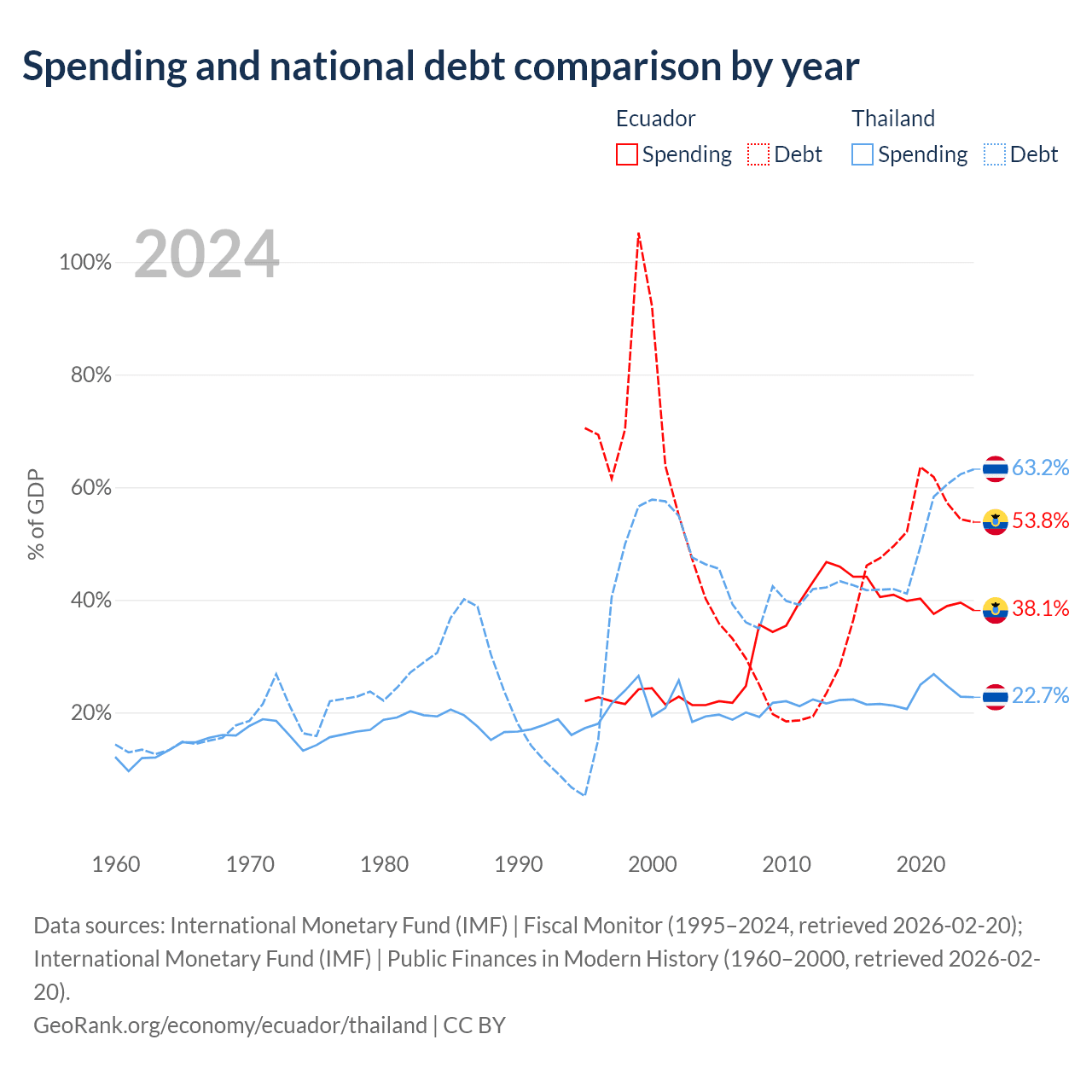 Ecuador has $67B in government debt (53.8% of GDP), compared to $333B (63.2% of GDP) in Thailand.
