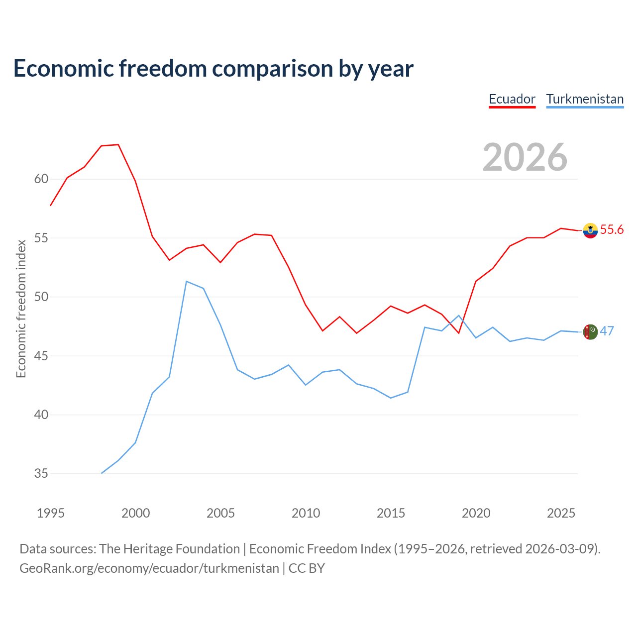 The Economic Freedom Index for Ecuador is 55.6, ranking 127/197, compared to 47 for Turkmenistan, ranking 177/197. The chart above displays a comparison of annual changes in economic freedom indexes.