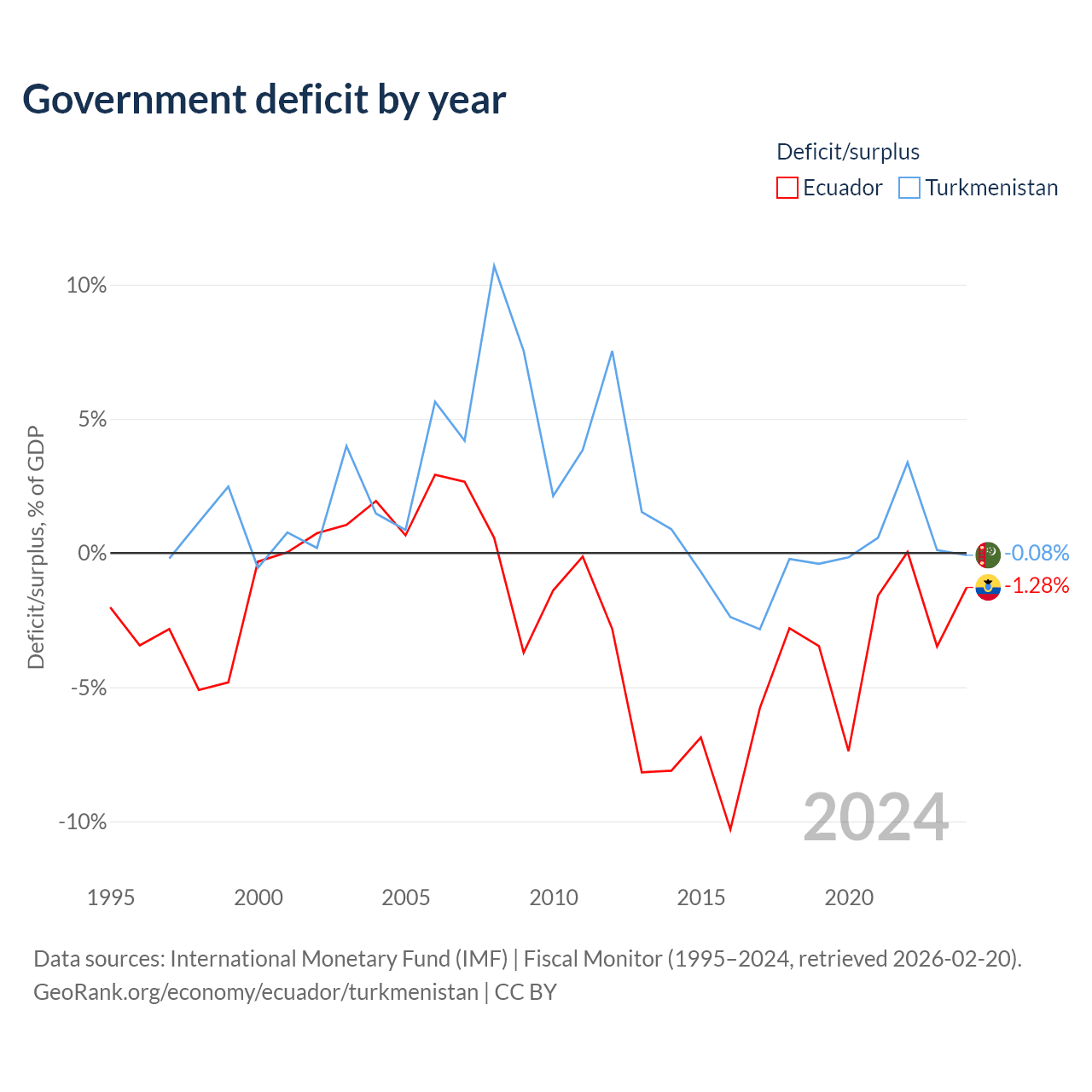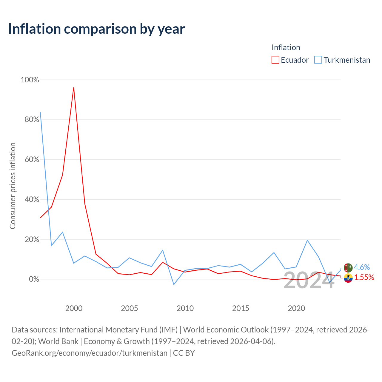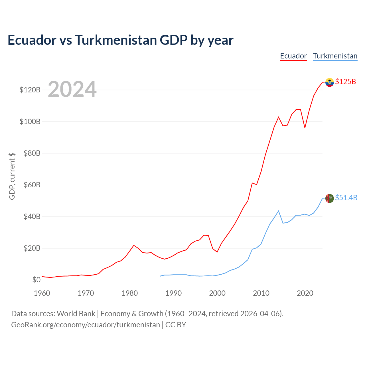 Ecuador has a GDP of $125B compared to $51.4B for Turkmenistan, ranking 62/197 and 92/197 by economy size, respectively.