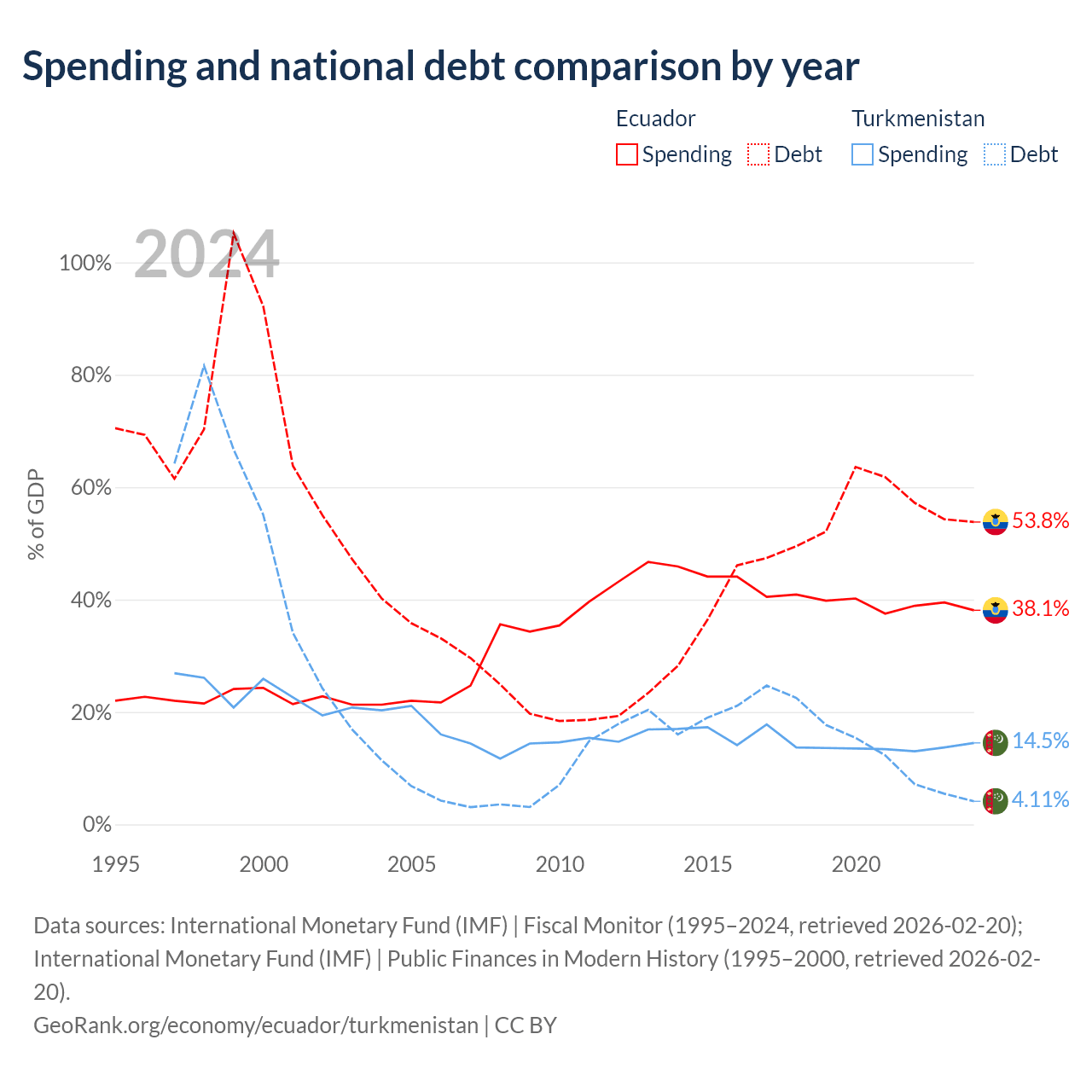 Ecuador has $67B in government debt (53.8% of GDP), compared to $2.11B (4.11% of GDP) in Turkmenistan.