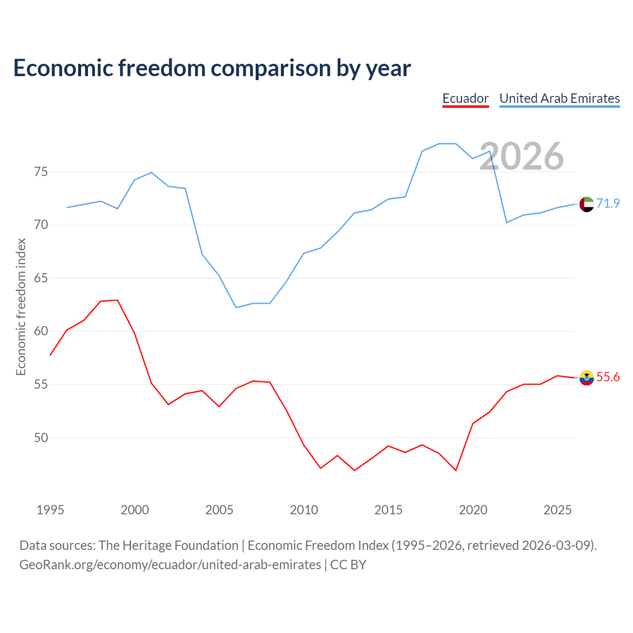 Data sources: The Heritage Foundation | Economic Freedom Index (1995–2026, retrieved 2026-03-09).