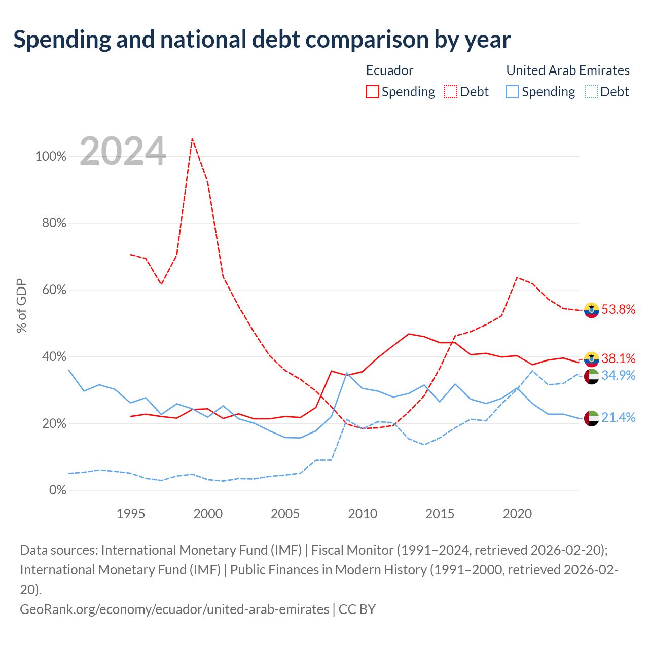 Ecuador has $67B in government debt (53.8% of GDP), compared to $193B (34.9% of GDP) in the United Arab Emirates.