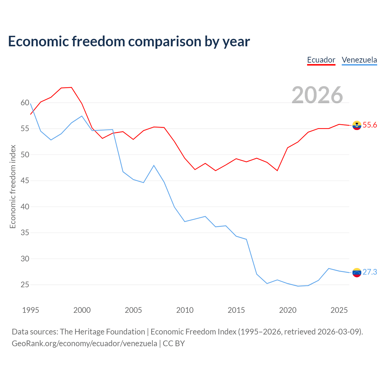 The Economic Freedom Index for Ecuador is 55.6, ranking 127/197, compared to 27.3 for Venezuela, ranking 194/197. The chart above displays a comparison of annual changes in economic freedom indexes.