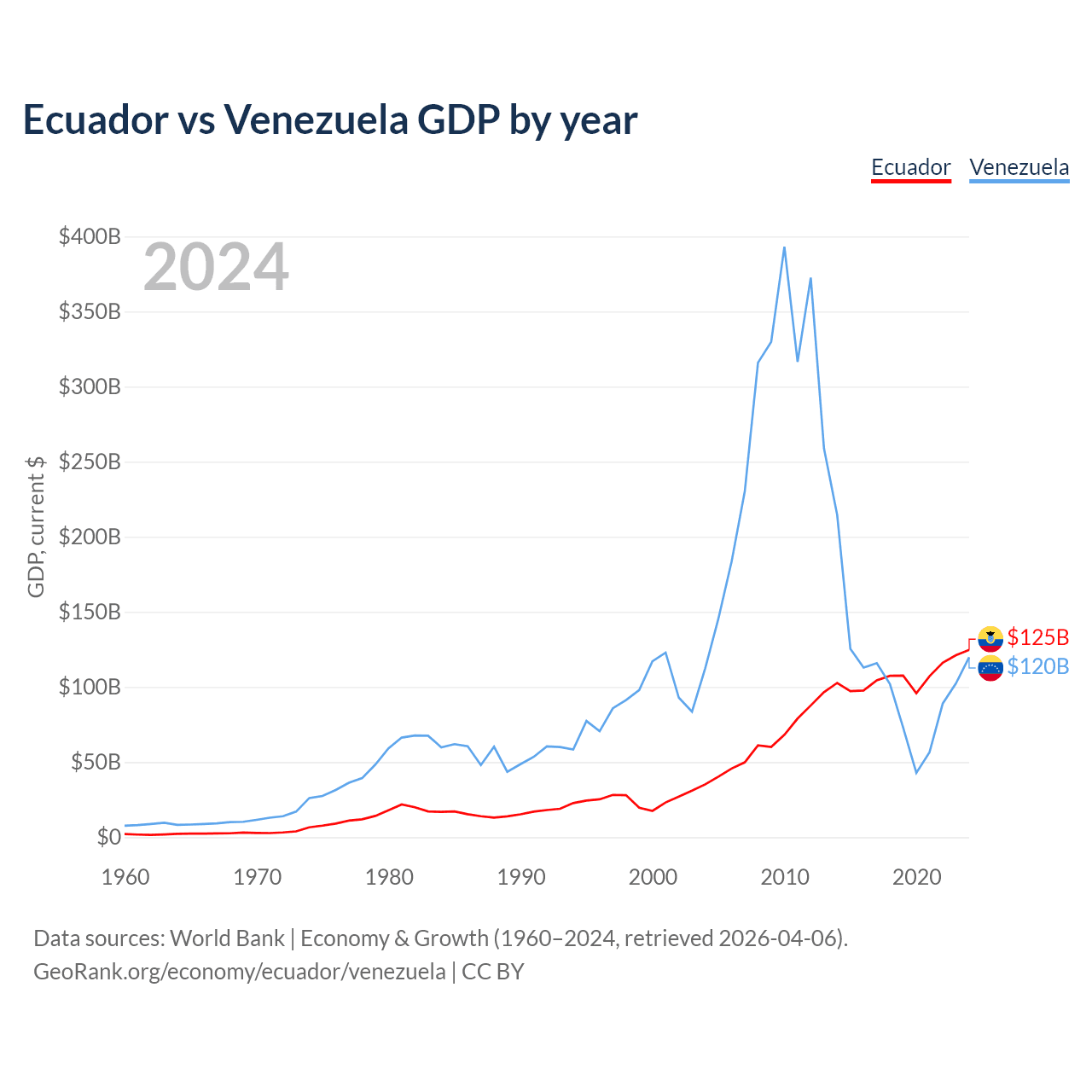 Ecuador has a GDP of $125B compared to $120B for Venezuela, ranking 62/197 and 65/197 by economy size, respectively.
