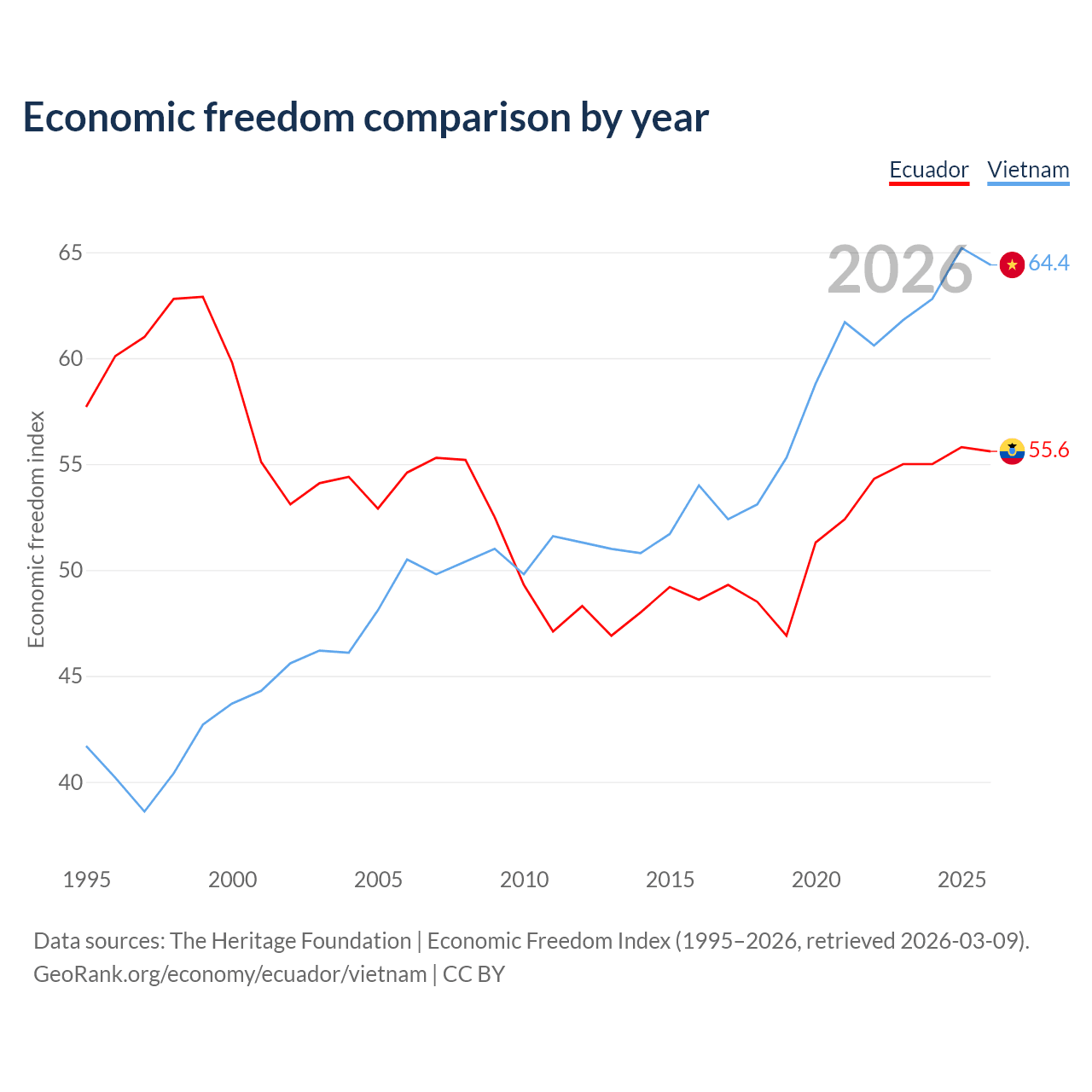 The Economic Freedom Index for Ecuador is 55.6, ranking 127/197, compared to 64.4 for Vietnam, ranking 73/197. The chart above displays a comparison of annual changes in economic freedom indexes.