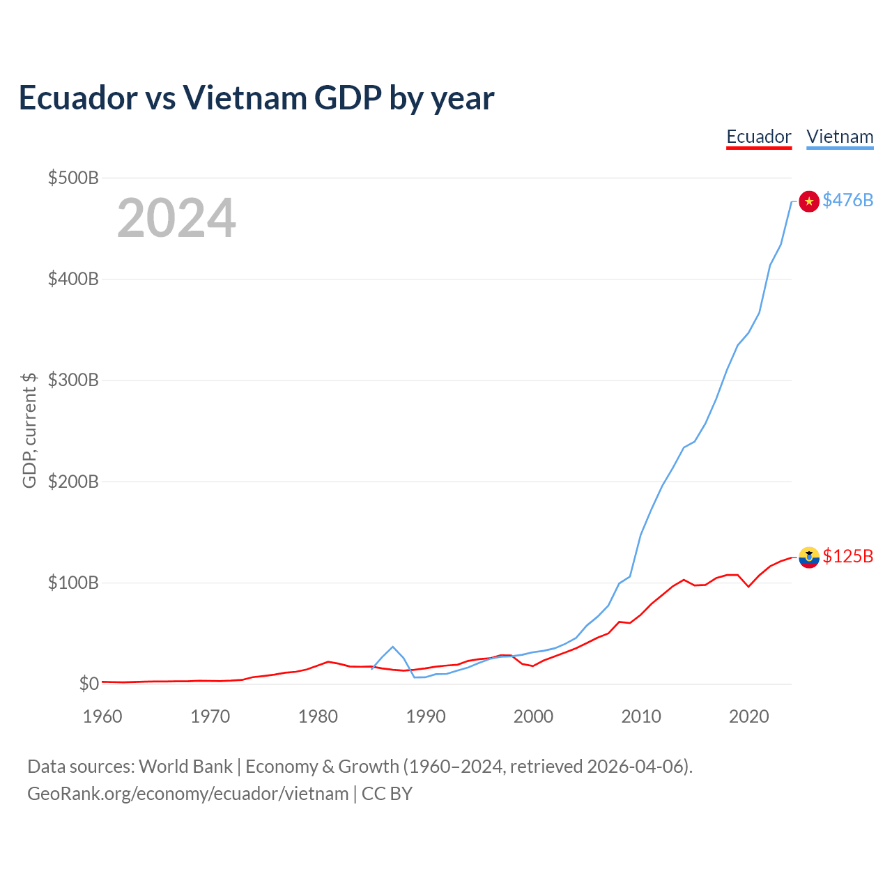 Ecuador has a GDP of $125B compared to $476B for Vietnam, ranking 62/197 and 33/197 by economy size, respectively.