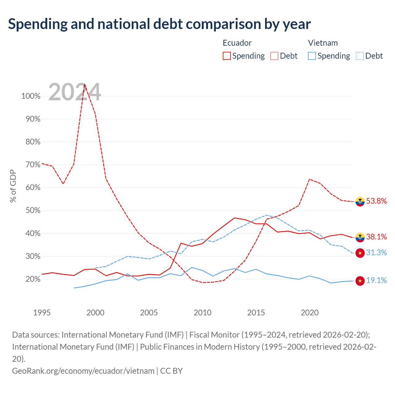 Ecuador has $67B in government debt (53.8% of GDP), compared to $149B (31.3% of GDP) in Vietnam.