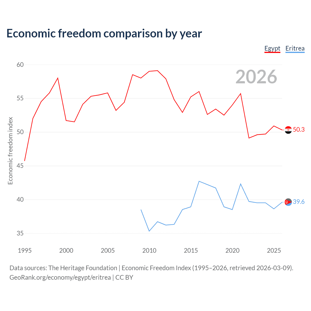 The Economic Freedom Index for Egypt is 50.3, ranking 160/197, compared to 39.6 for Eritrea, ranking 188/197. The chart above displays a comparison of annual changes in economic freedom indexes.