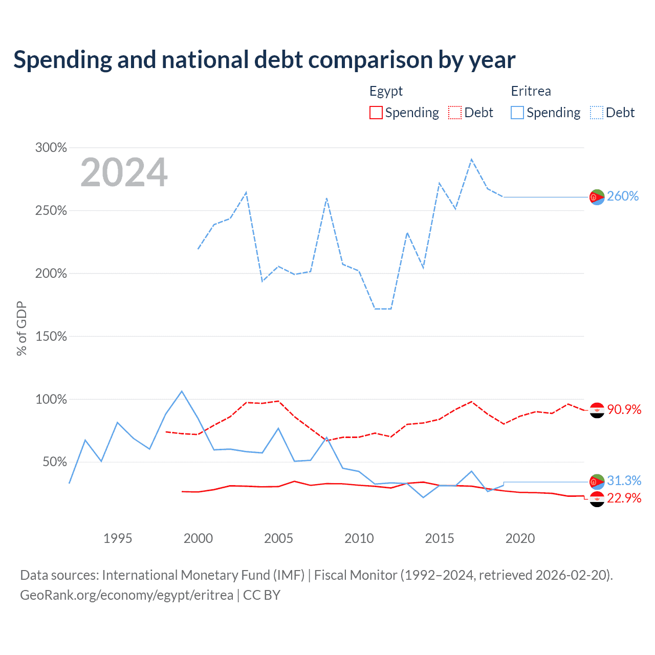 Egypt has $354B in government debt (90.9% of GDP), compared to $3.54B (260.4% of GDP) in Eritrea.