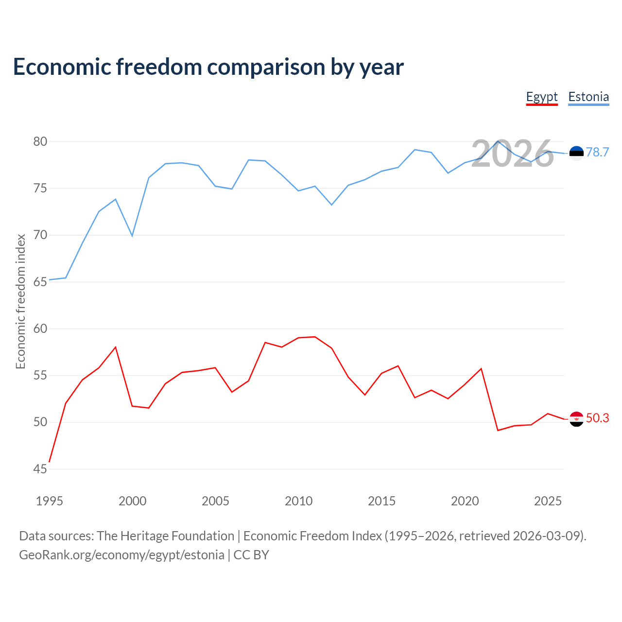 The Economic Freedom Index for Egypt is 50.3, ranking 160/197, compared to 78.7 for Estonia, ranking 10/197. The chart above displays a comparison of annual changes in economic freedom indexes.