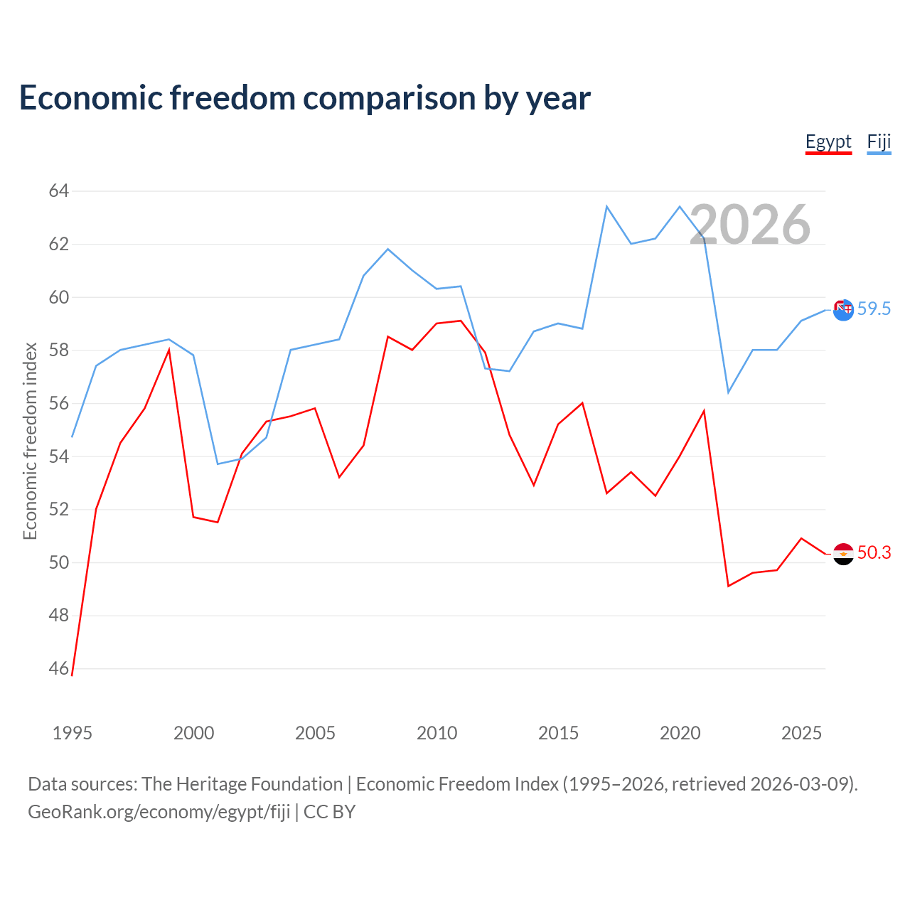 The Economic Freedom Index for Egypt is 50.3, ranking 160/197, compared to 59.5 for Fiji, ranking 103/197. The chart above displays a comparison of annual changes in economic freedom indexes.