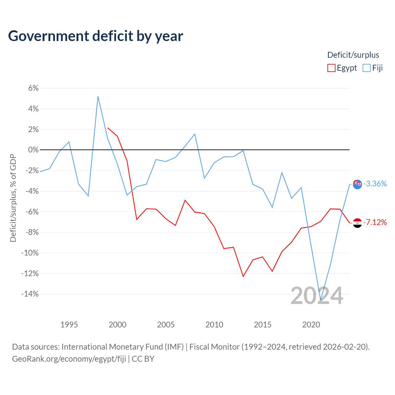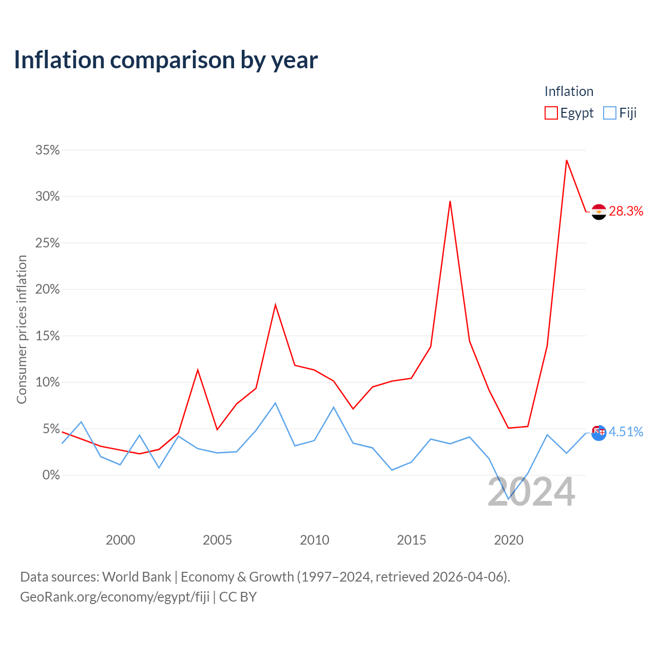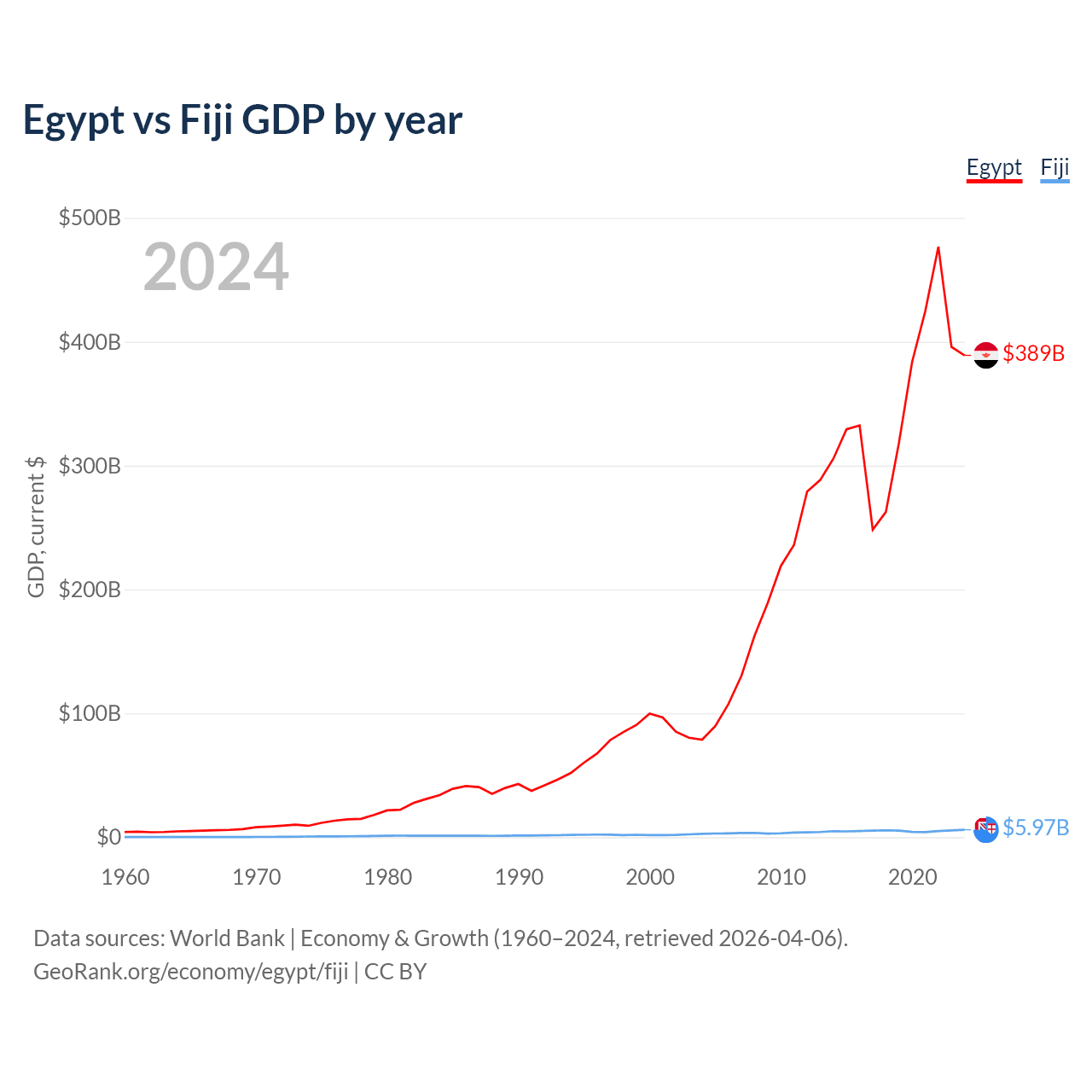 Egypt has a GDP of $389B compared to $5.97B for Fiji, ranking 41/197 and 161/197 by economy size, respectively.