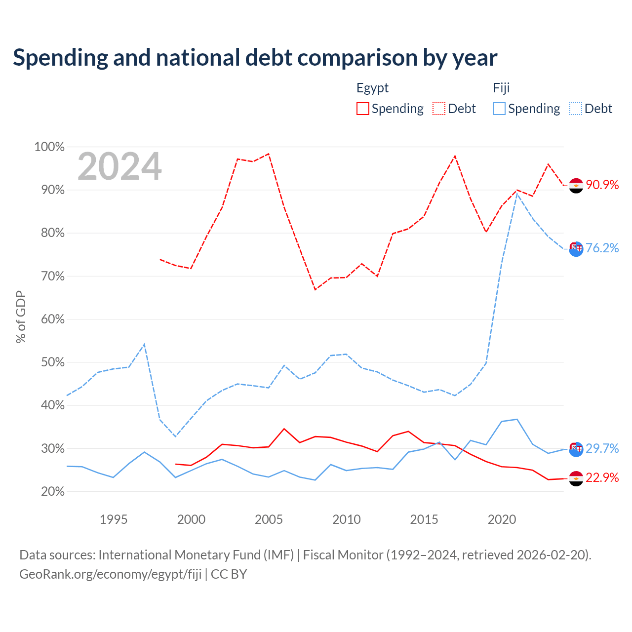 Egypt has $354B in government debt (90.9% of GDP), compared to $4.54B (76.2% of GDP) in Fiji.