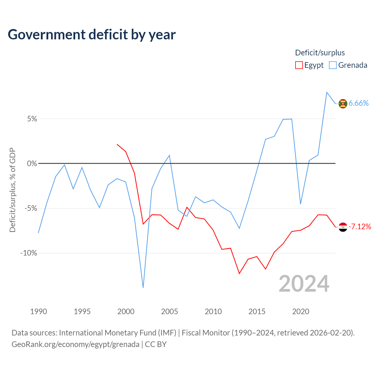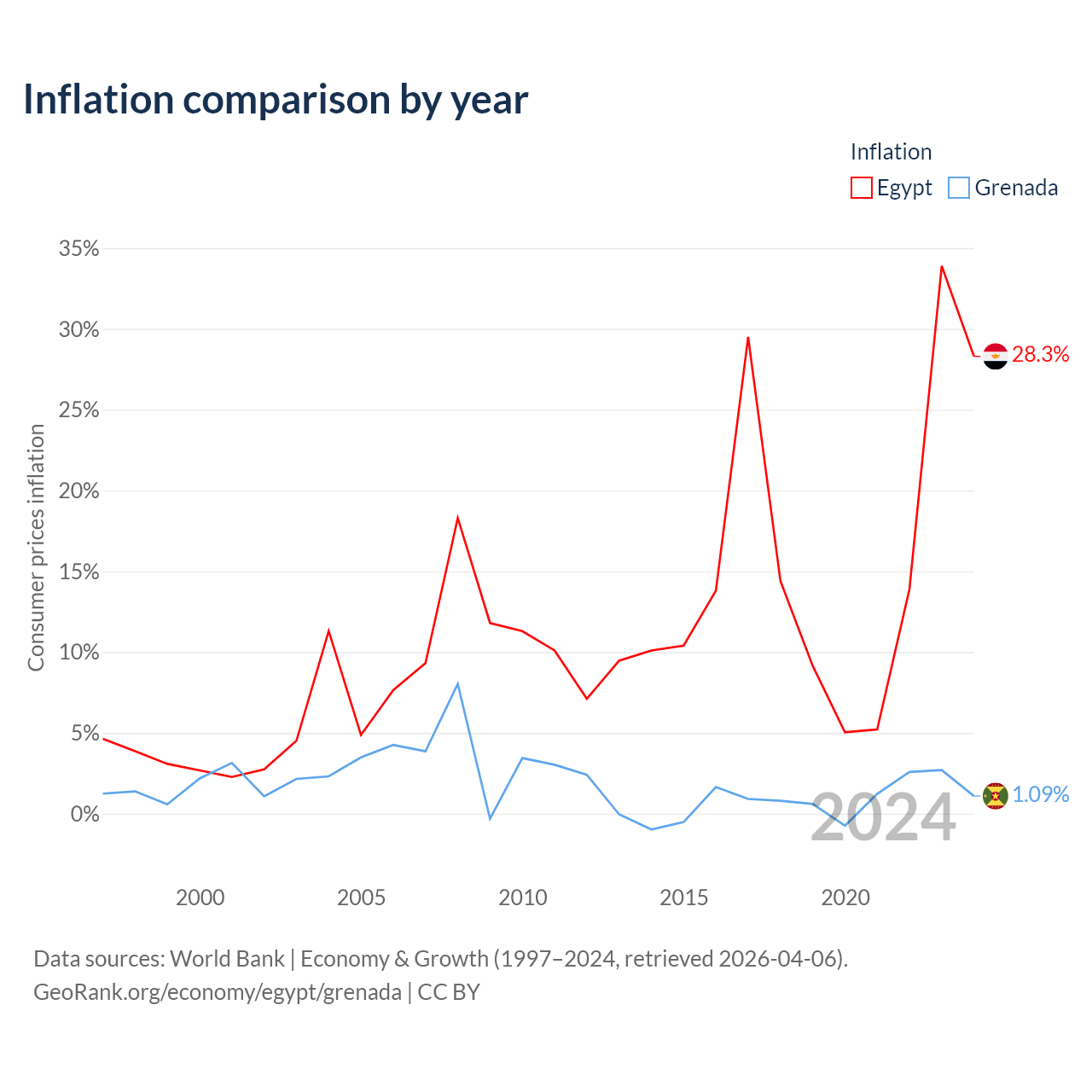 Egypt has a GDP of $389B compared to $1.37B for Grenada, ranking 41/197 and 184/197 by economy size, respectively.