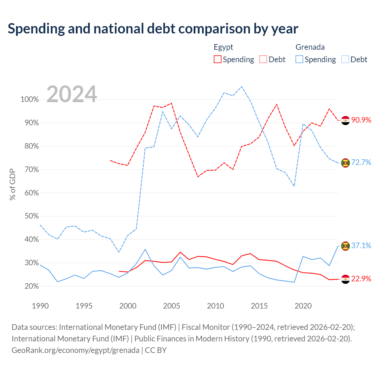 Egypt has $354B in government debt (90.9% of GDP), compared to $997M (72.7% of GDP) in Grenada.