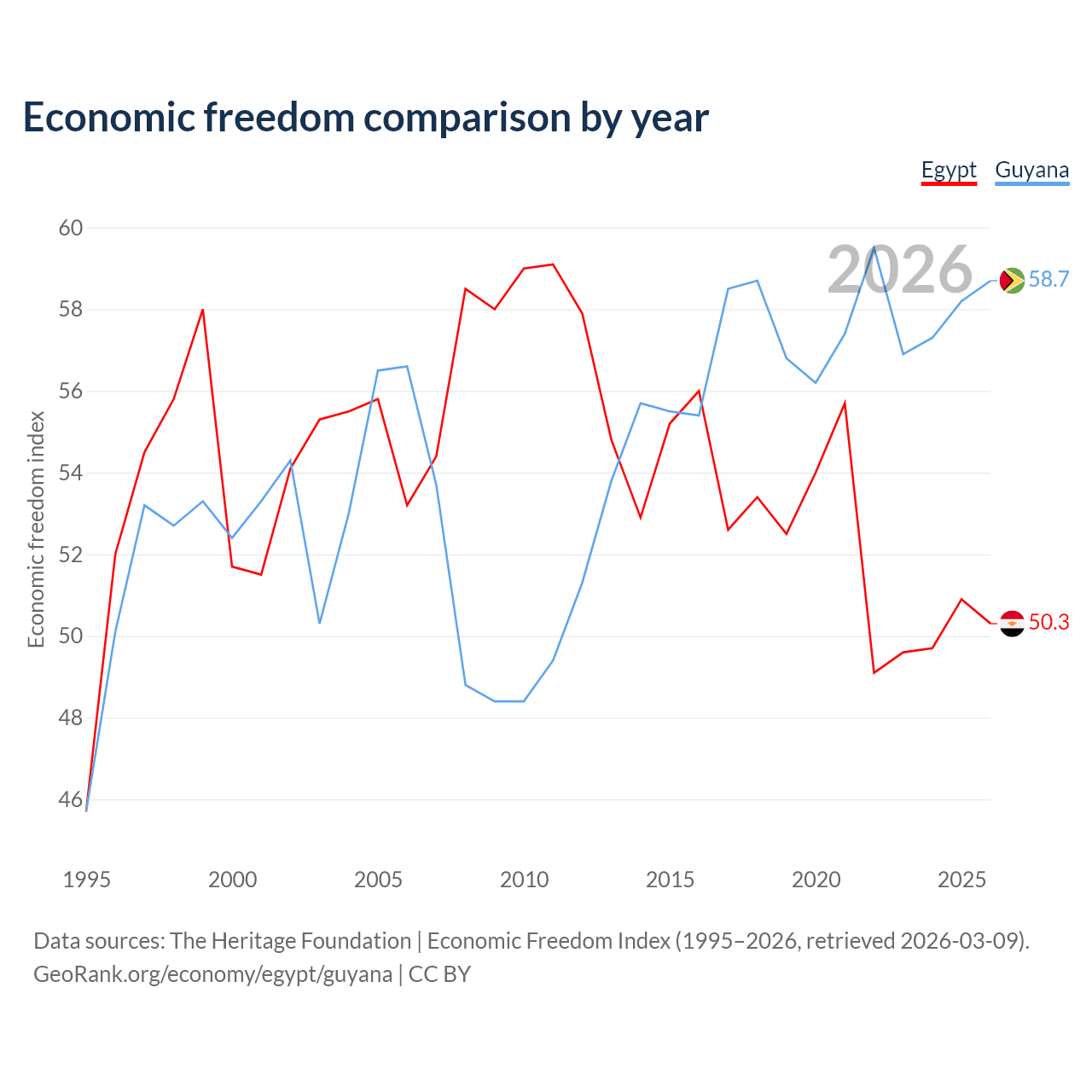 The Economic Freedom Index for Egypt is 50.3, ranking 160/197, compared to 58.7 for Guyana, ranking 109/197. The chart above displays a comparison of annual changes in economic freedom indexes.