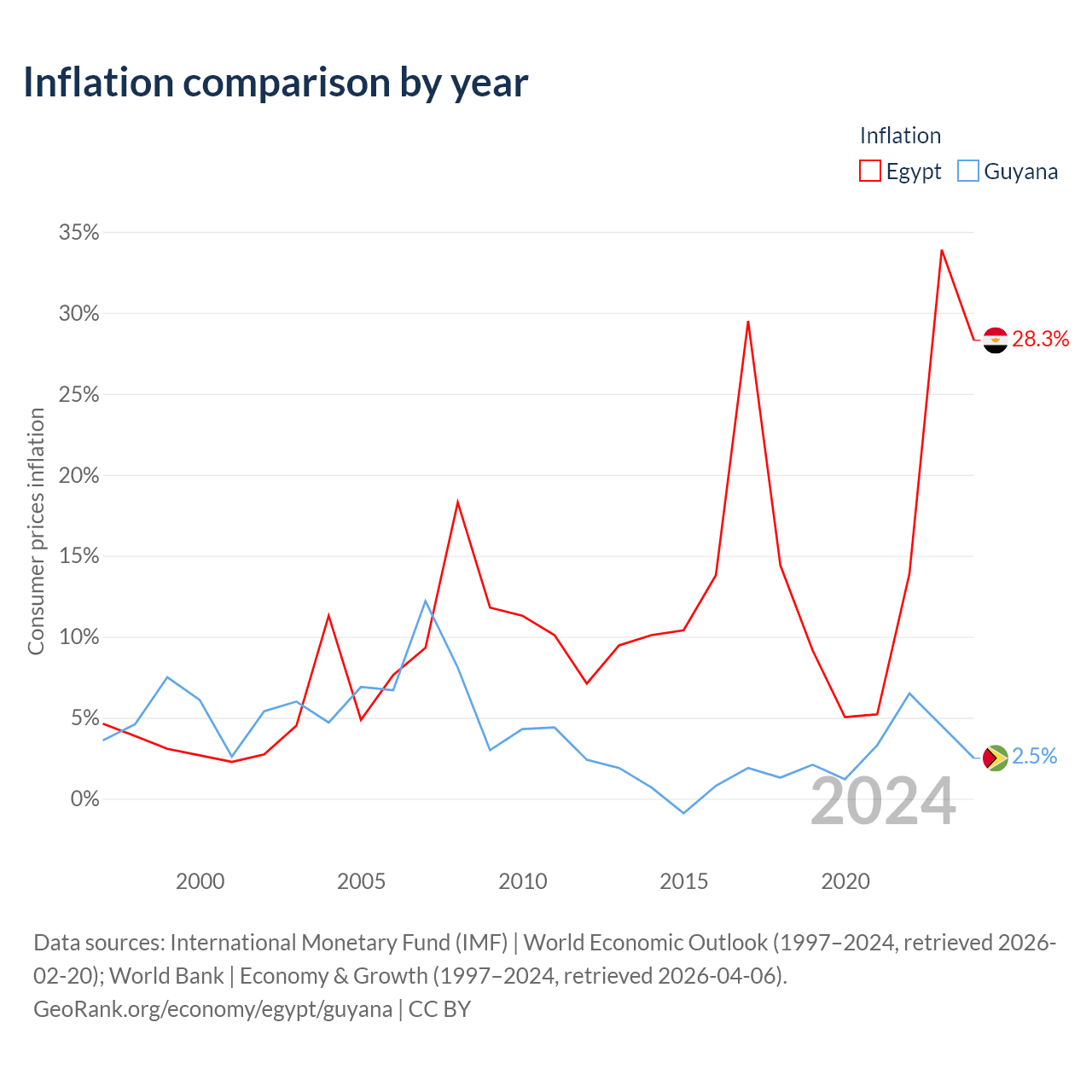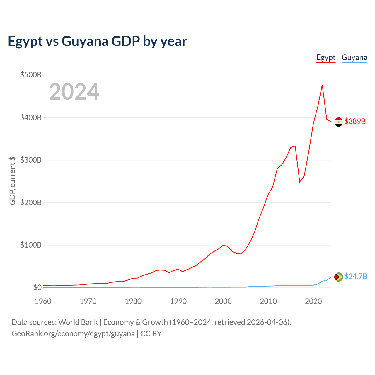 Egypt has a GDP of $389B compared to $24.7B for Guyana, ranking 41/197 and 120/197 by economy size, respectively.