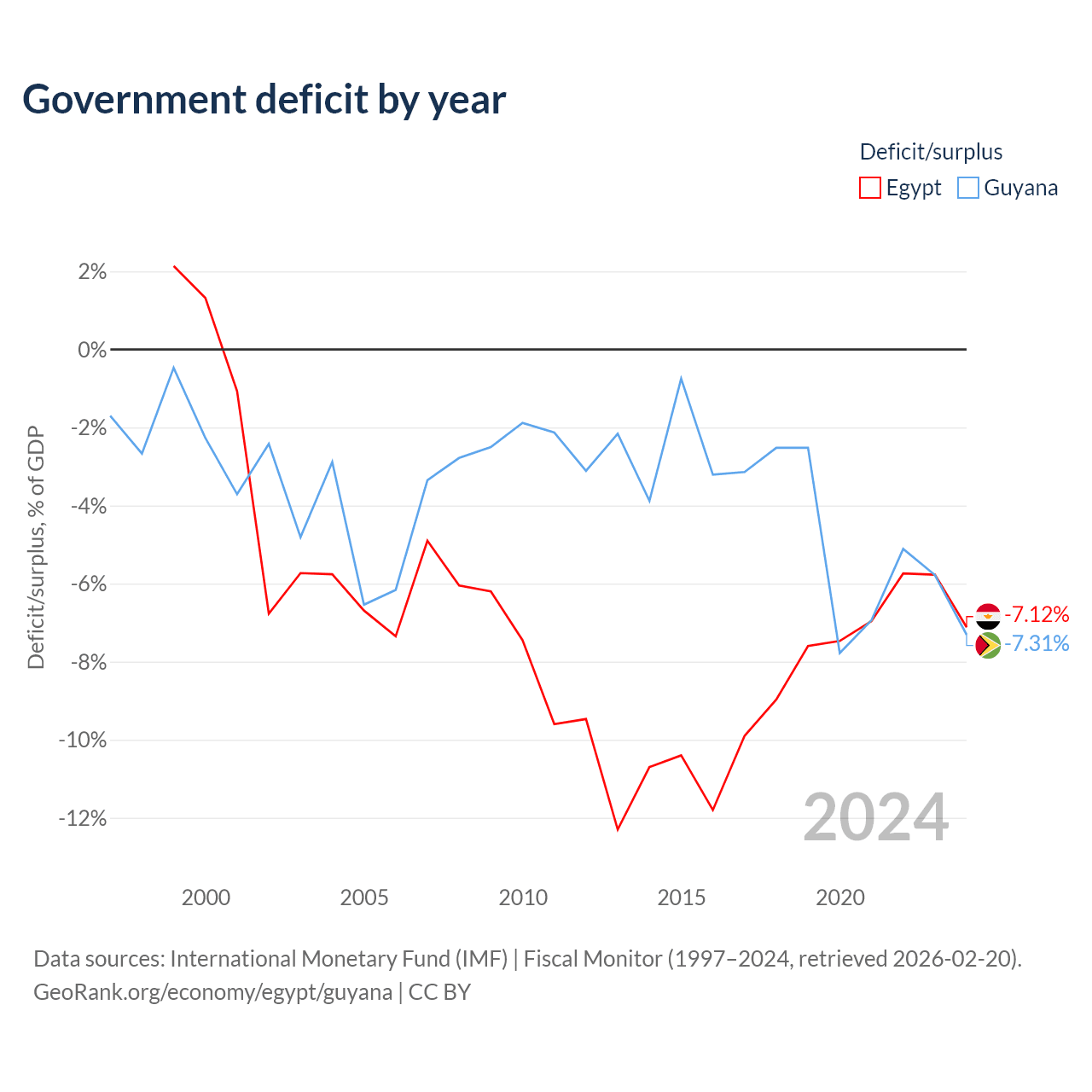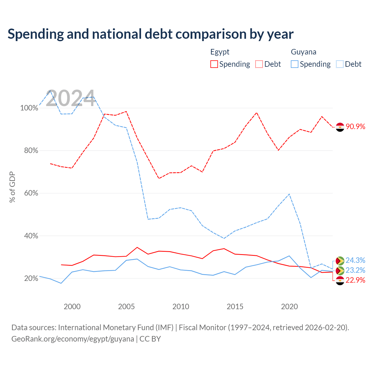 Egypt has $354B in government debt (90.9% of GDP), compared to $5.99B (24.3% of GDP) in Guyana.