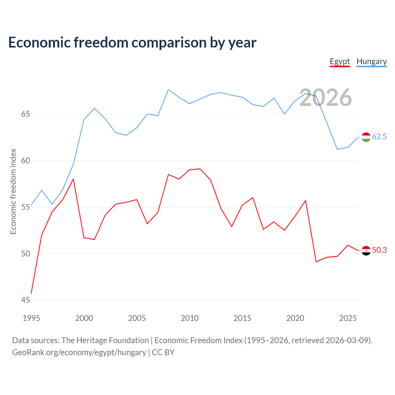 The Economic Freedom Index for Egypt is 50.3, ranking 160/197, compared to 62.5 for Hungary, ranking 86/197. The chart above displays a comparison of annual changes in economic freedom indexes.